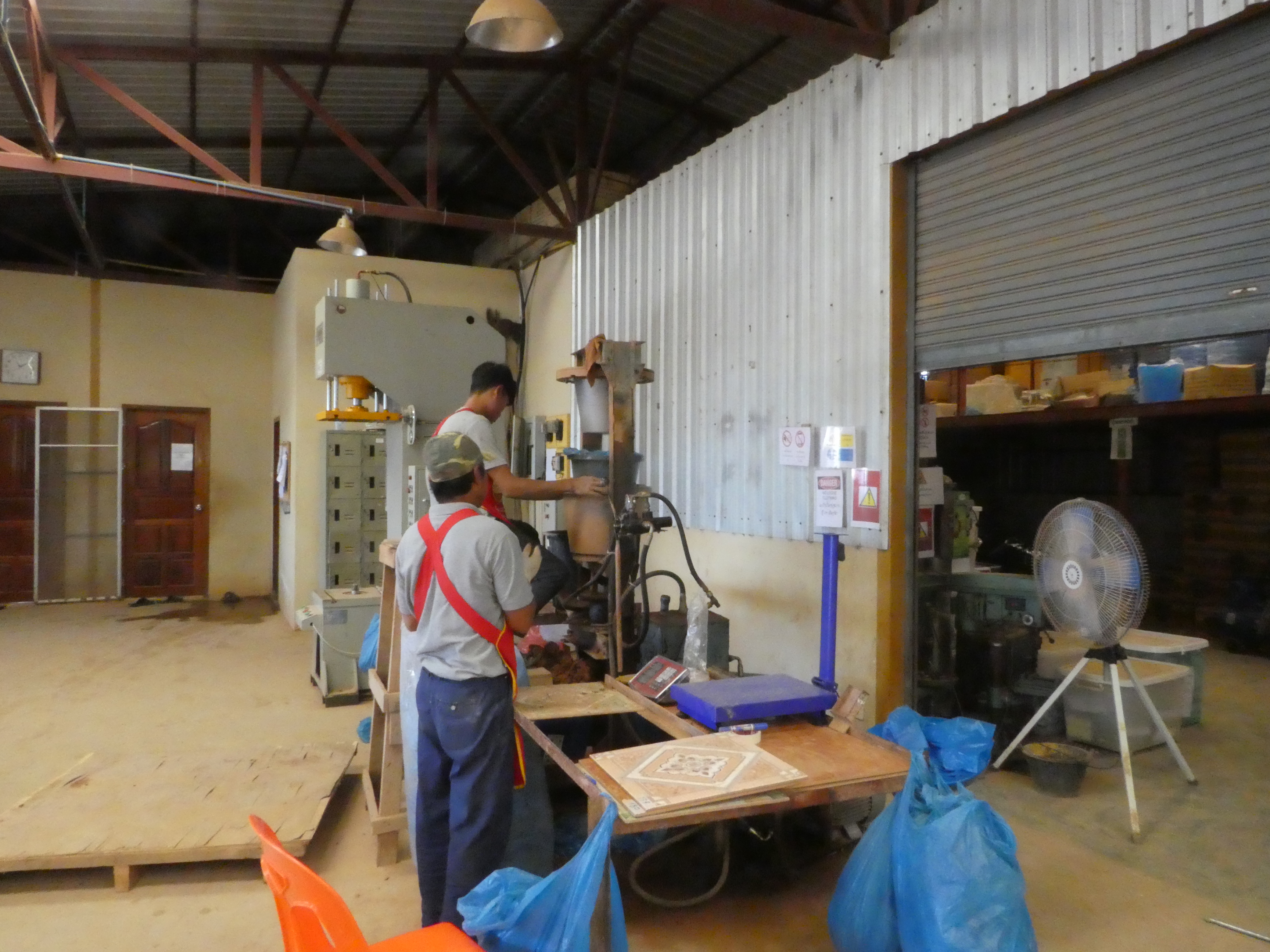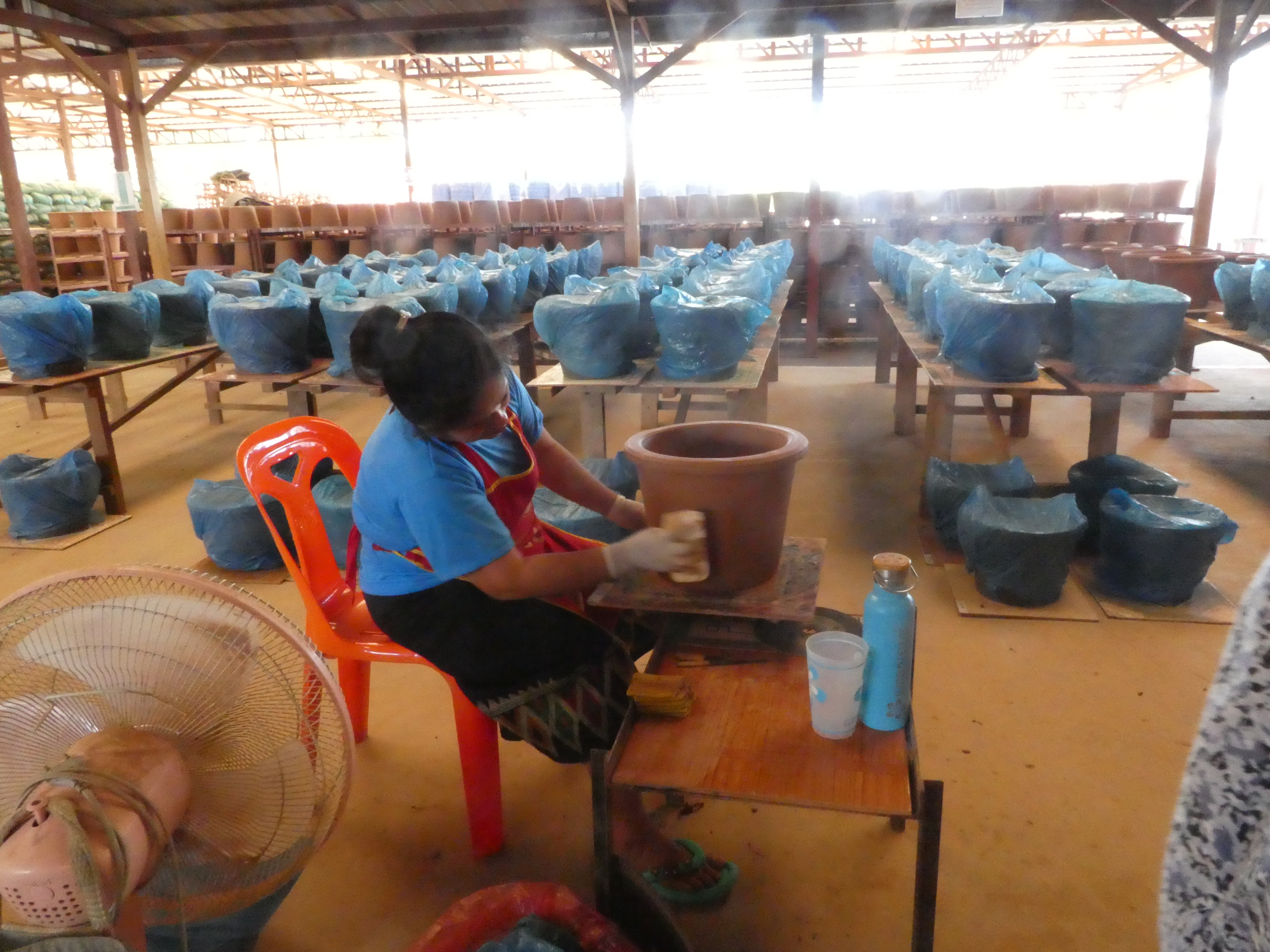 D’abord on mélange les deux terres finement moulues  dans des proportions précises, puis on leur ajoute aussi une quantité bien déterminée de balle de riz moulue. On ajoute de l’eau bien mesurée à tout ça, puis les pâtons soigneusement pesés vont à la presse. Il en sort un gros pot encore tout mou, qui va ensuite passer dans des mains expertes pour des finitions propres. Ce sera le filtre à eau proprement dit.