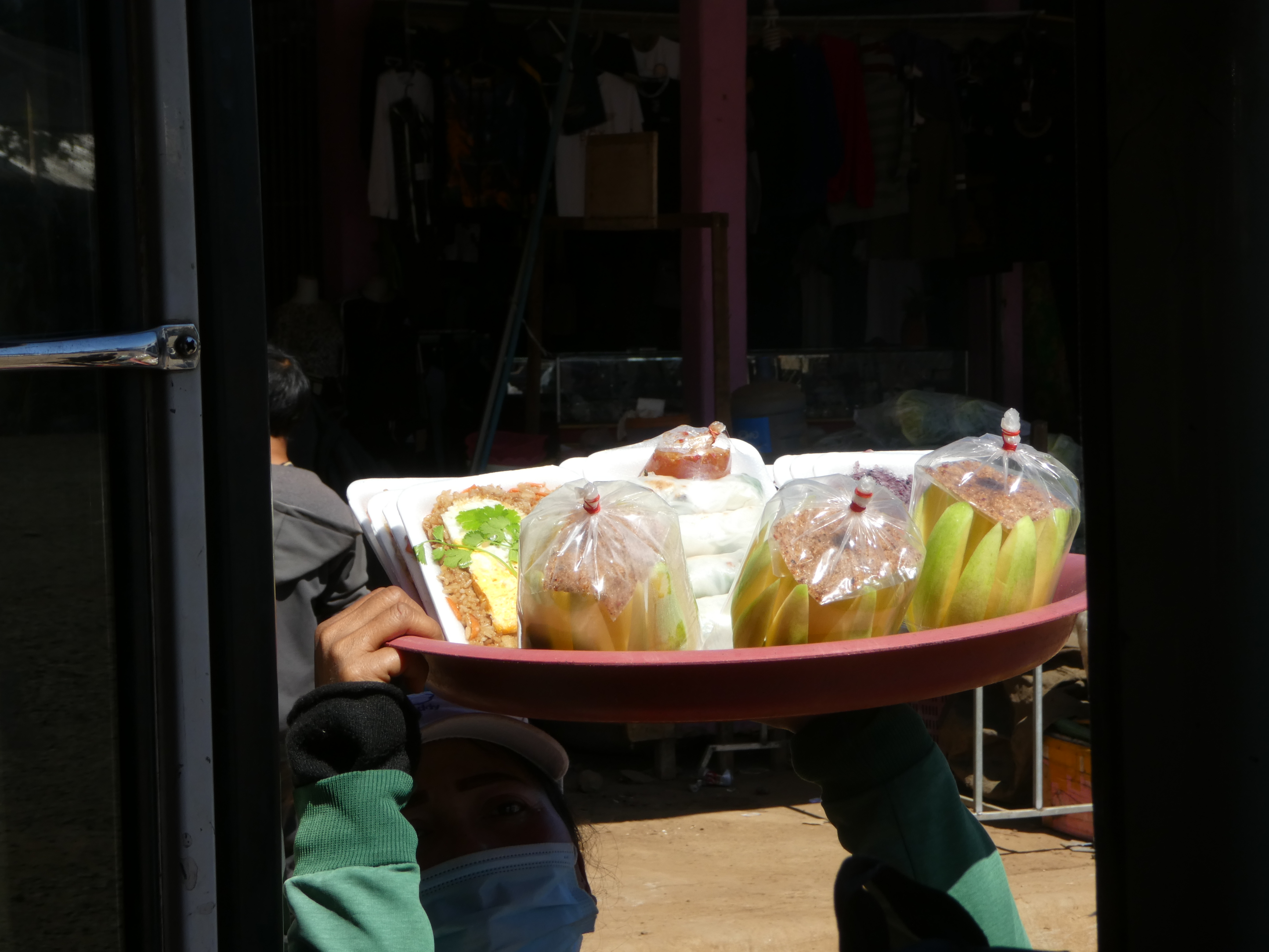 Notre bus fait un détour par Thatèng, la route la plus directe étant coupée par un camion qui s’est renversé sur un pont. Arrêt derrière le marché de Thatèng, ou des dames montent à bord pour nous vendre à manger. Nous achetons une mangue verte à manger avec le traditionnel mélange piment-sel sucre, quel délice!