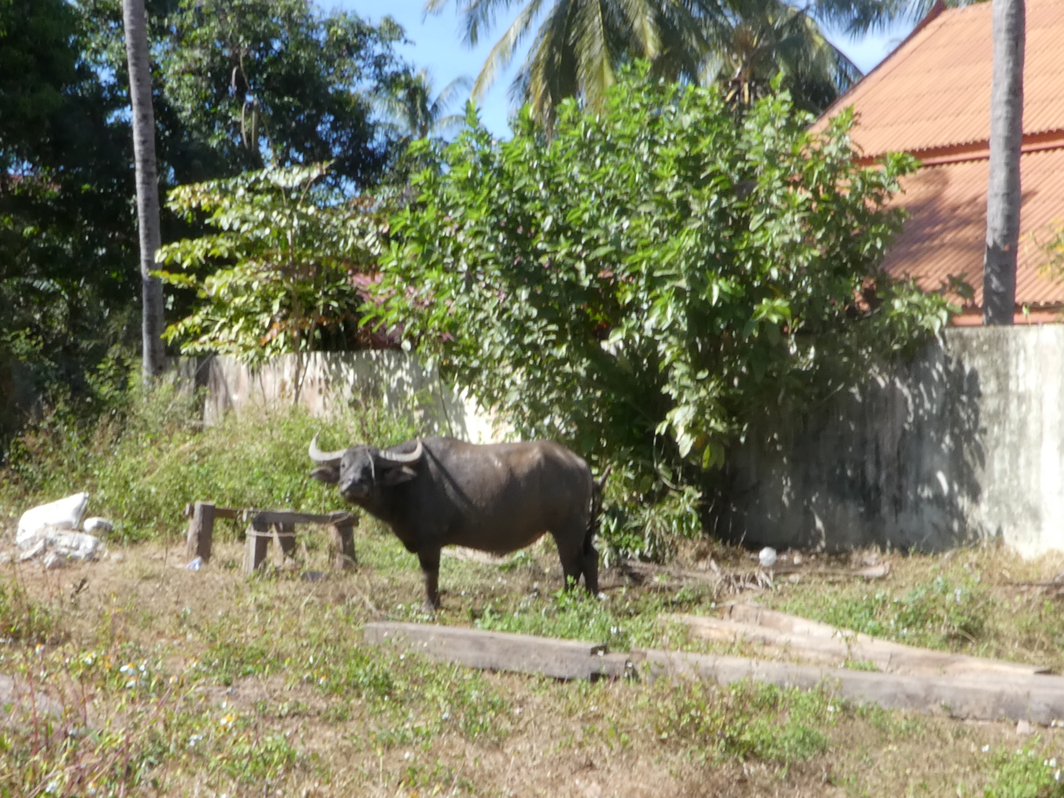 Tout cela sous le regard placide d’un énorme buffle. Celui-ci est attaché, heureusement, car il est vraiment imposant.