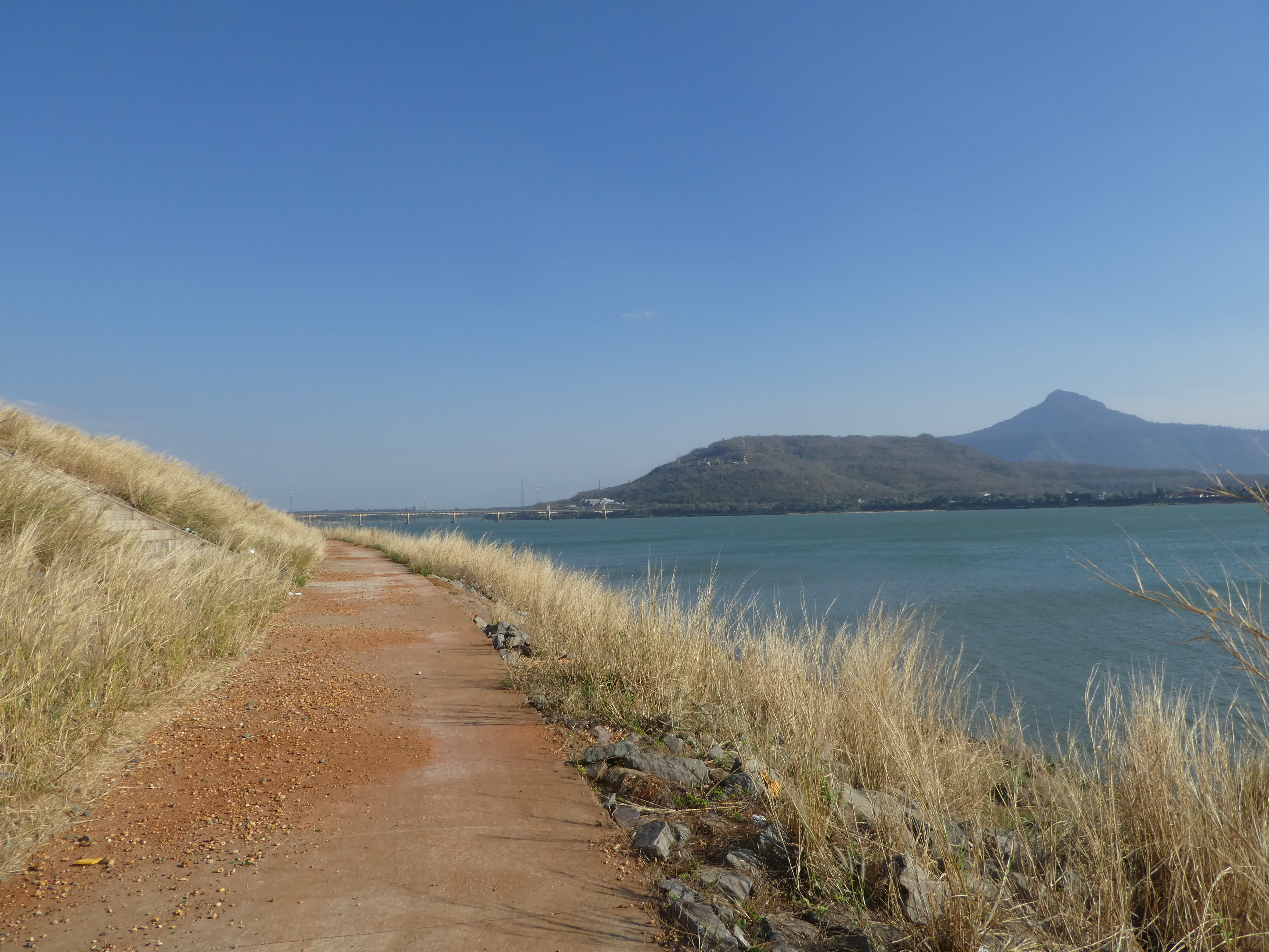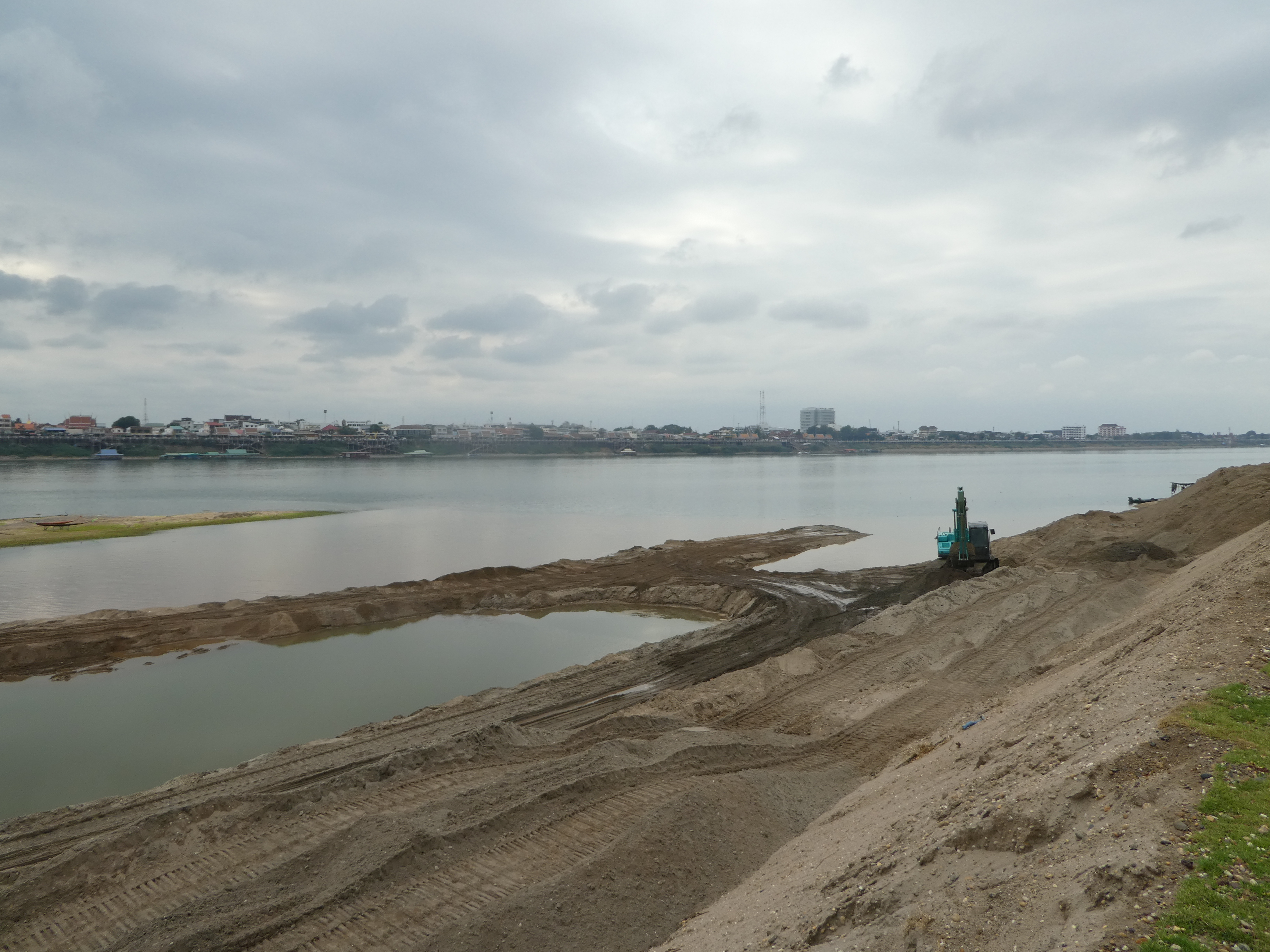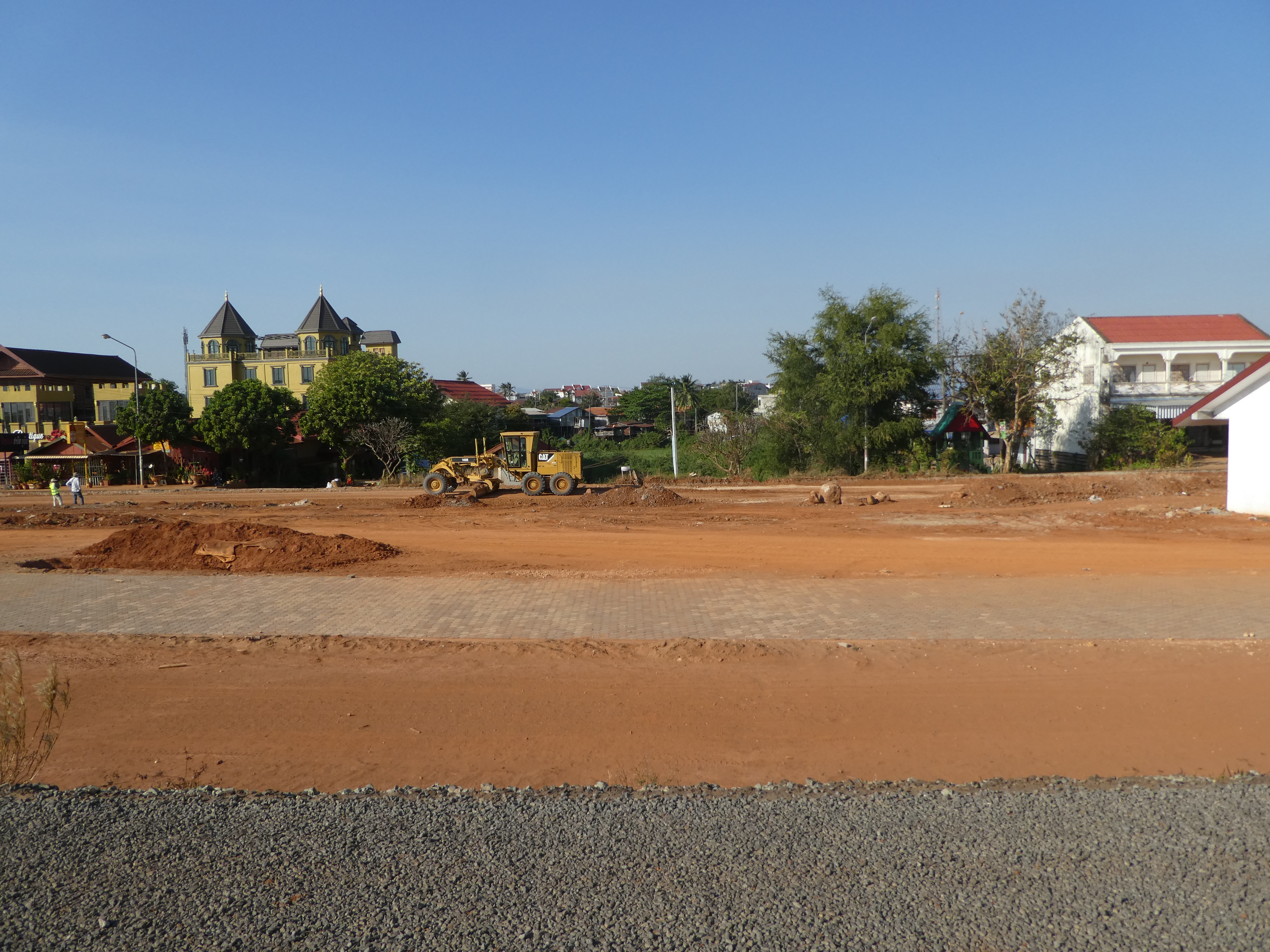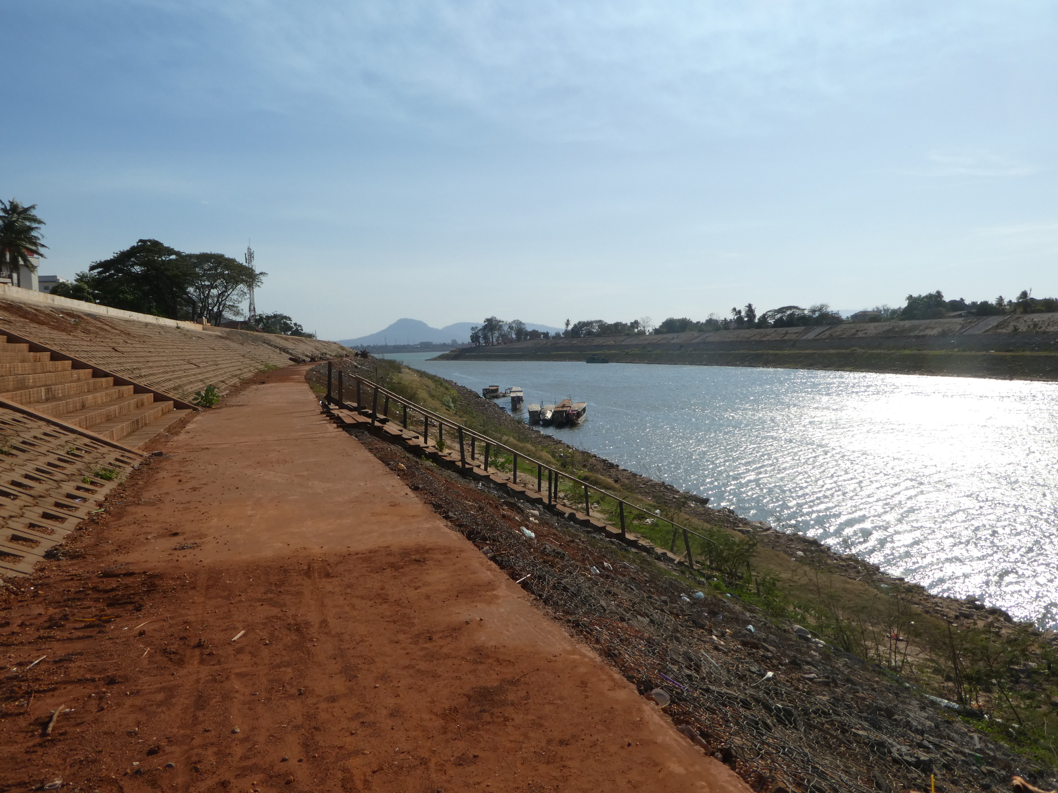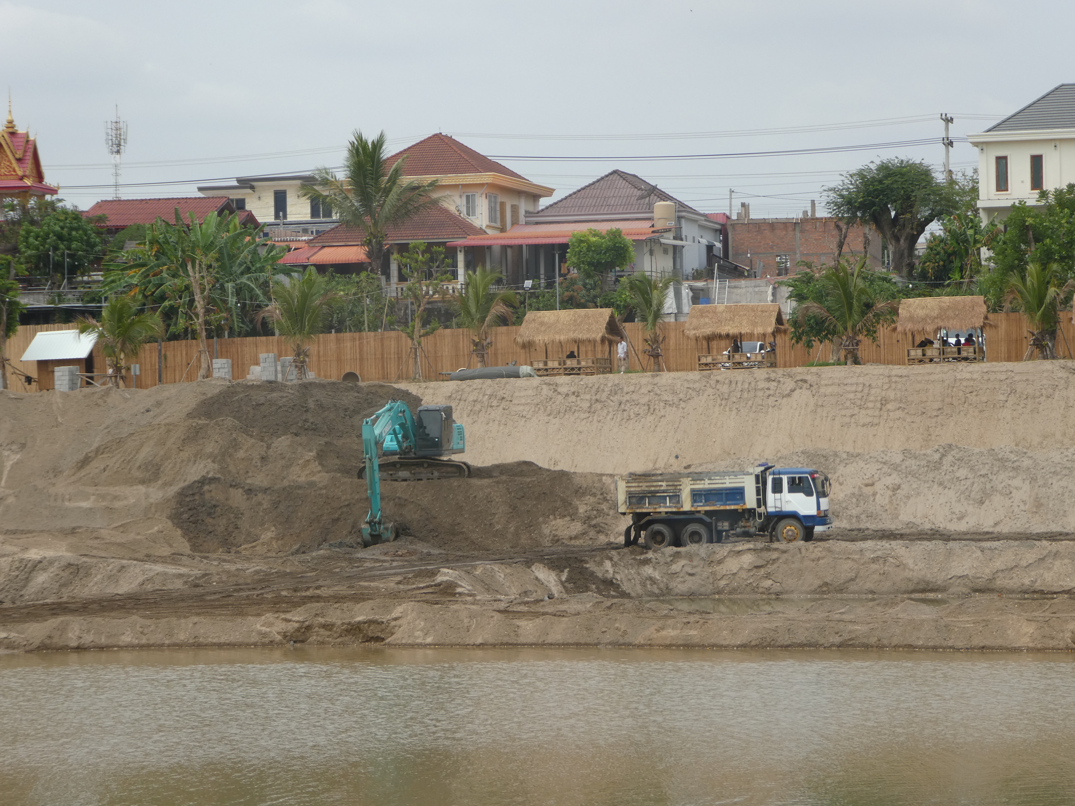Retour sur la digue, une route est encore en construction. Et la zone entre la future route et la digue n’est pas encore aménagée. C’est juste du sable rouge, et le vent le soulève. Il y aurait besoin d’arbres dans ce coin, pour que cela devienne agréable. On voit bien sur cette image combien le lit du fleuve a été rétréci. Avant, la zone berges commençait approximativement au niveau du trax. C’était plein de végétation et d’arbres, et des petites cabanes perchées sur des piliers de bois servaient de restaurants tout le long.