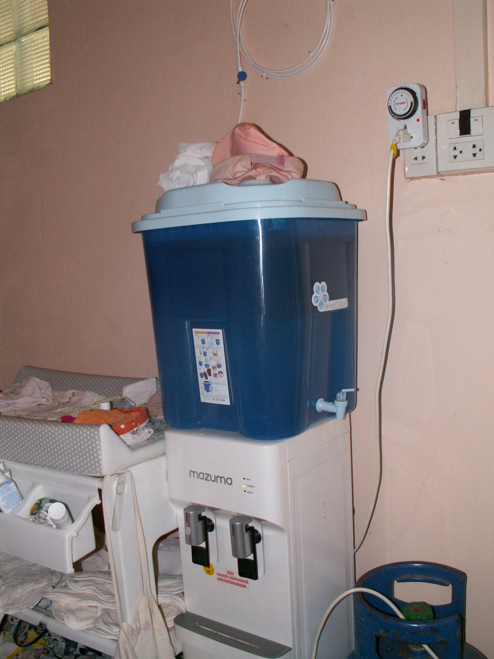 Après la visite de TerraClear hier, il faut encore que je vous présente le projet conjoint du SFE avec cette entreprise. Pour commencer, voici comment se présente un filtre opérationnel, ici dans une maison d’expat, et donc placé sur une « machine » à faire de l’eau fraîche.