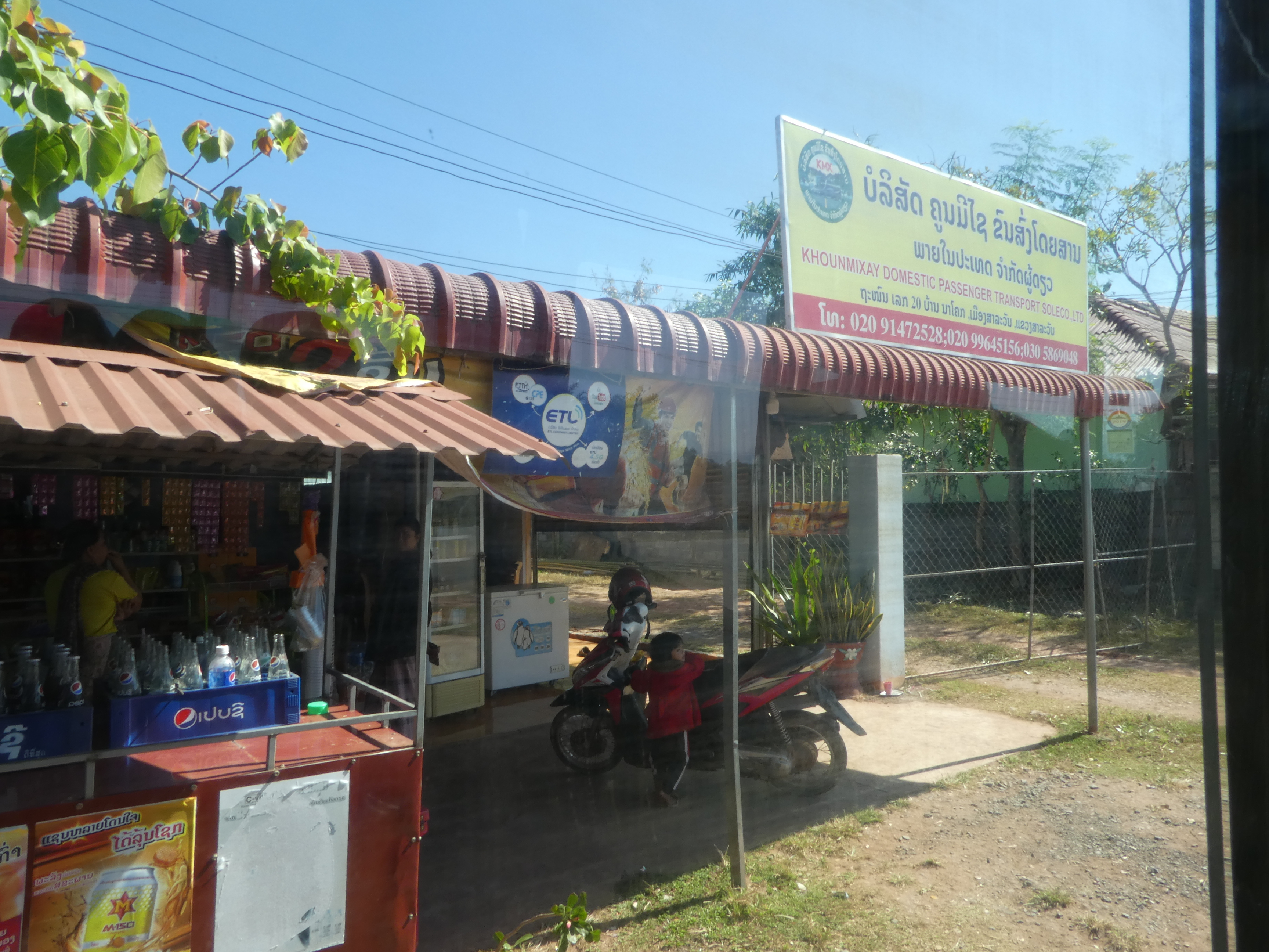 Voici donc le bus qui va nous emmener sur Paksé. Il n’est pas de première nouveauté, mais on verra à l’usage. il n’est pas plein au départ, et étonnamment, pas surchargé de marchandises diverses. Il faut dire que nous allons de la petite ville à la grande et non le contraire. a peine sortis de la gare de bus, nous nous arrêtons pour prendre quelques passagers, puis encore quelques autres un peu plus loin. Il faut ensuite faire le plein du véhicule. Puis le plein du chauffeur, qui soudain s’arrête devant une maison à gauche de la route, y entre et y mange un peu de riz.