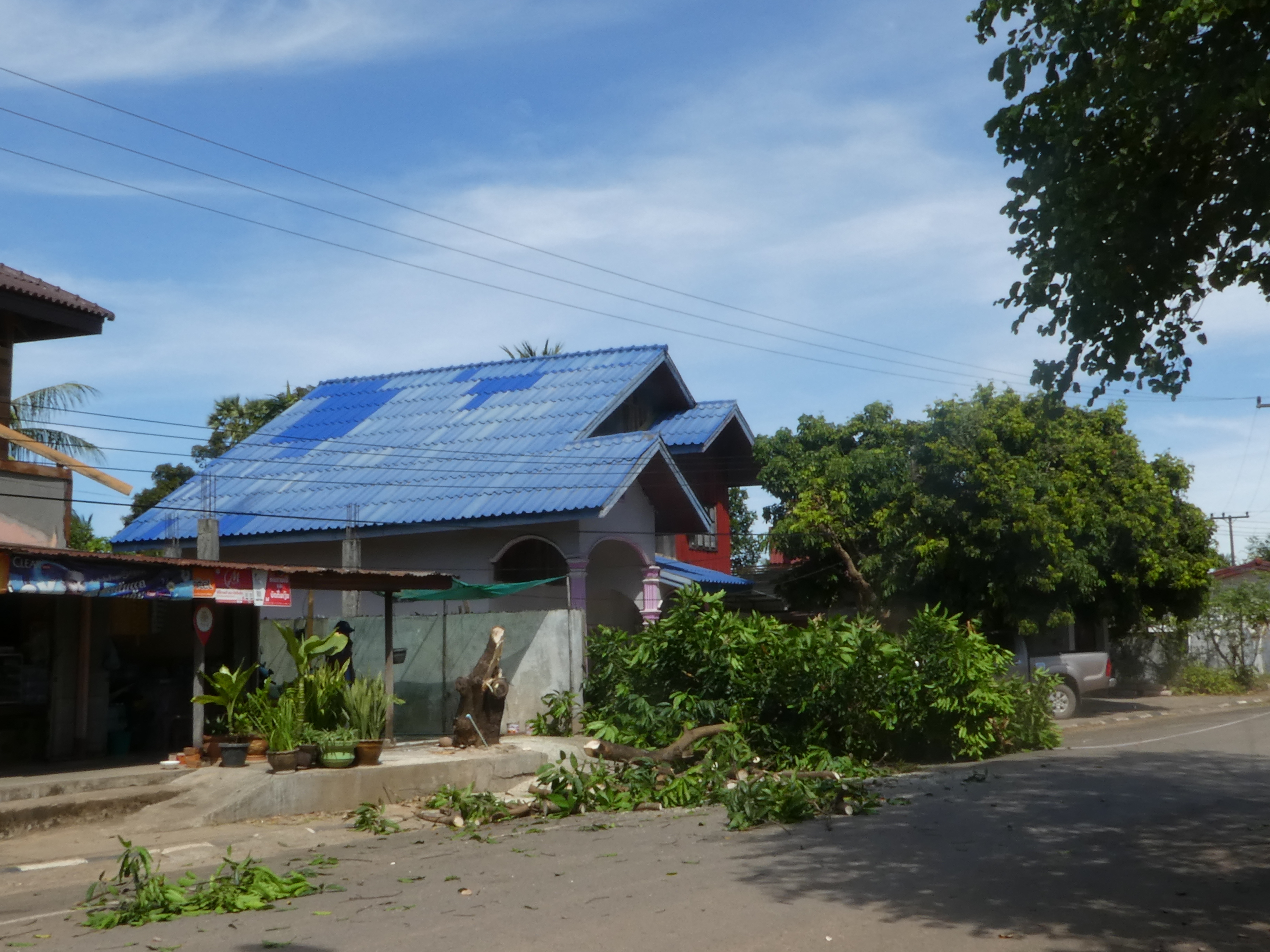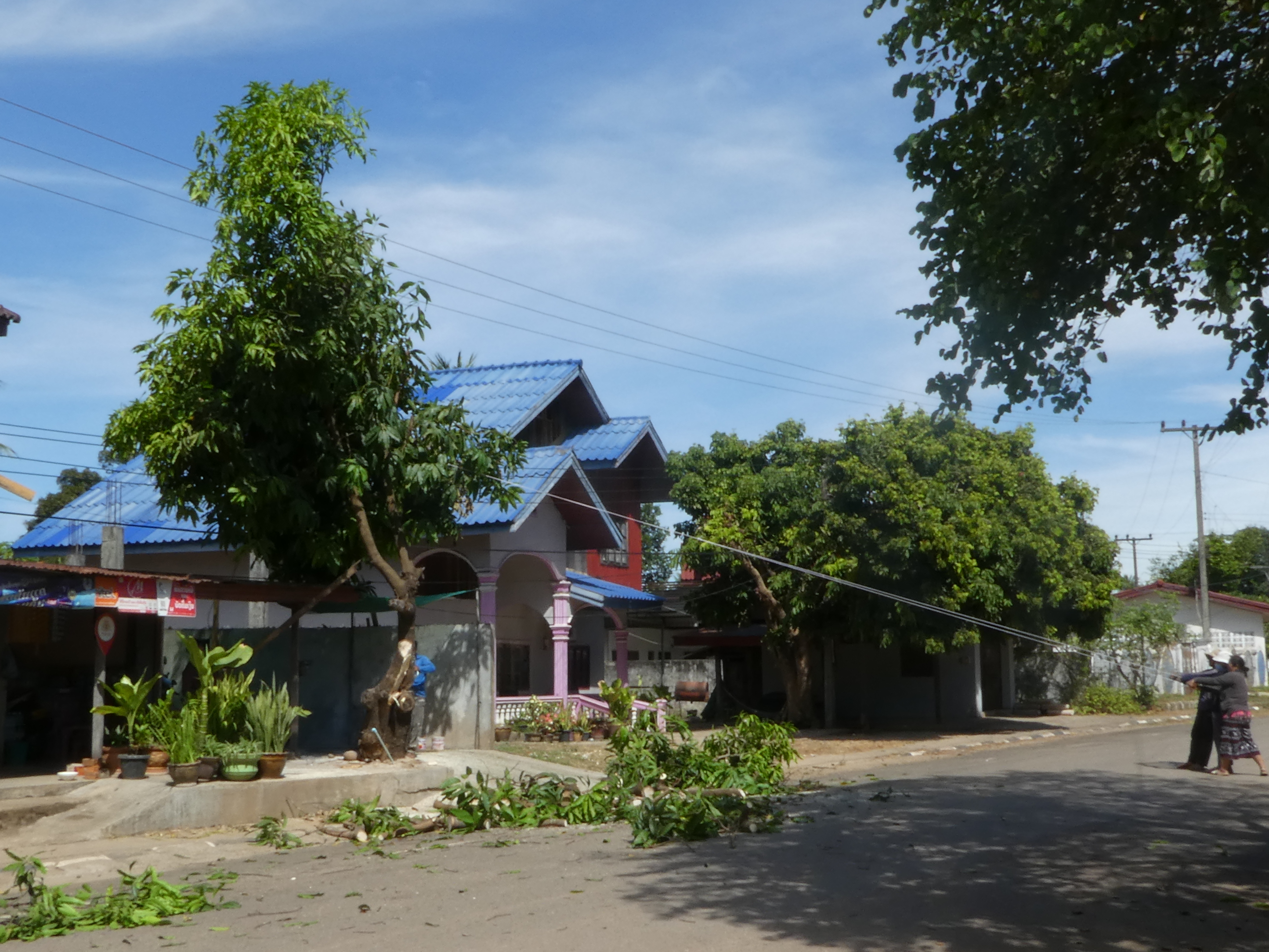 Ici, petit travail du samedi matin, on abat un gros vieux manguier. Les plus grosses branches ont déjà été coupées, l’arbre a déjà une belle encoche et un coin métallique pour le faire tomber du bon côté. Maintenant, on assure en tirant à la corde, il faut encore quelques bon coups de tronçonneuse, l’arbre est noueux, mais finalement le voilà par terre. Le tronc est aussitôt débité, cela fera une réserve de bois de feu.