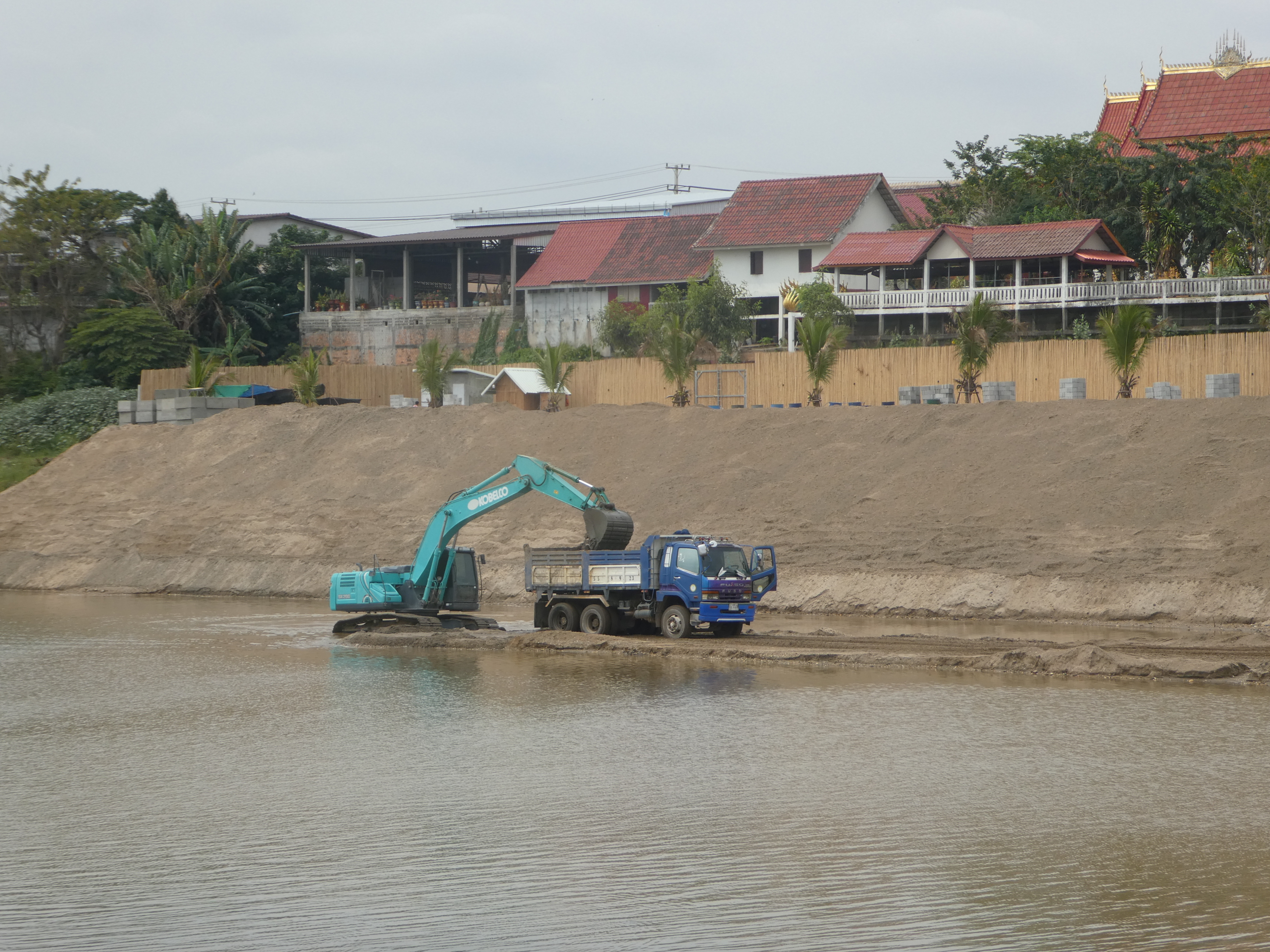 Quelques images que l’on voit beaucoup le long du Mékong, partout et dans les grandes largeurs. L’exploitation du sable, et la création de digues. Difficile de dire à quel point cela est réfléchi et planifié, et à quel point c’est juste lucratif. Des questions pour ingénieurs et têtes pensantes, à l’heure ou par chez nous, on « re-naturalise »certaines rivières, ici la tendance semble être contraire.