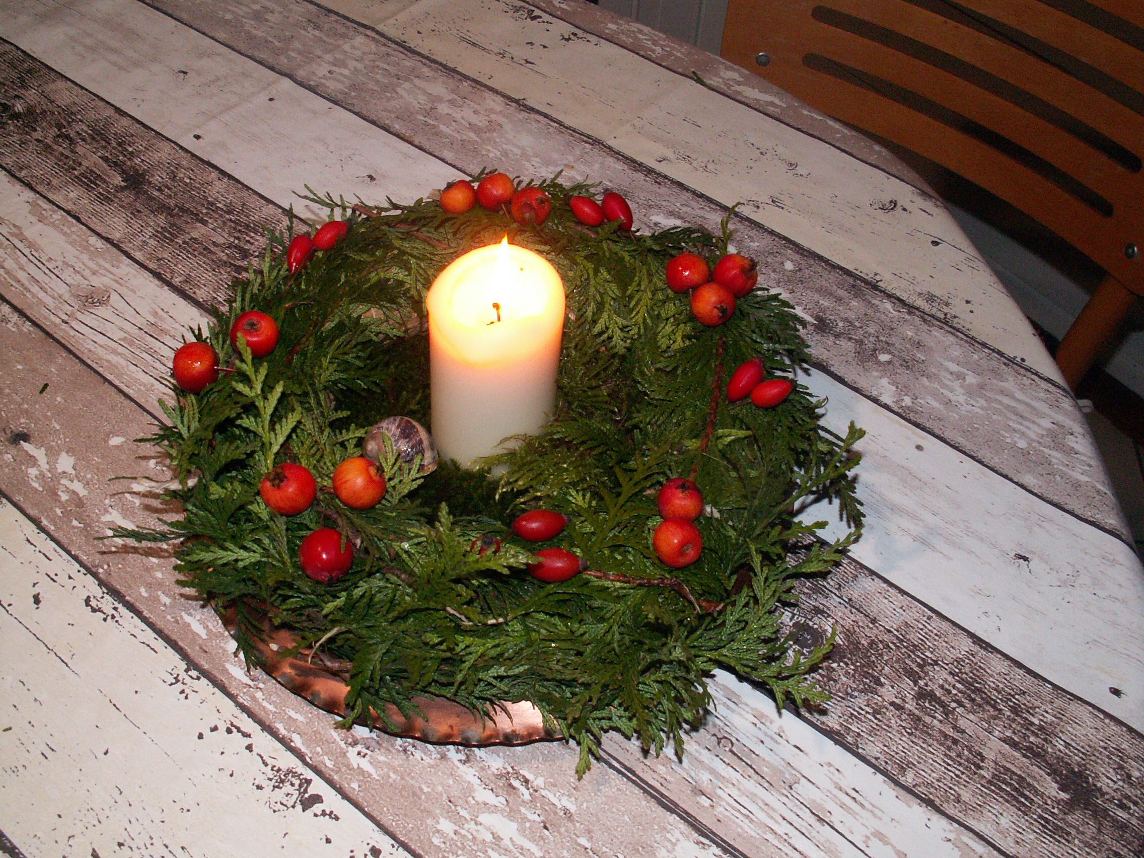 Ma couronne de l’Avent. Depuis quelques années, je ne lui mets qu’une bougie… parce que j’en ai marre d’avoir 4 bougies inégalement consumées à la fin de la période, qui ensuite finissent par attendre je ne sais quoi au fond d’un placard. Ma couronne est garnie de thuya pris dans une haie qui se développe anarchiquement, et décorée de cynorhodons et de ces mini pommes que l’on voit dans les vergers, pour favoriser la pollinisation de certaines variétés je crois.