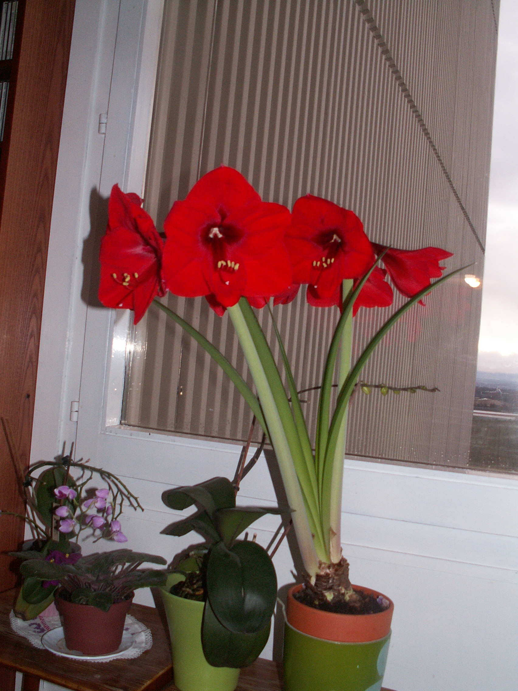 Dans nos pays, si parfois la neige illumine le paysage rendant chaque détail féérique, souvent les jours sont plutôt gris. Soit par le brouillard, soit par la pluie. Un petit « jardin » d’intérieur met alors un peu de couleur dans les journées d’hiver…et permet de rêver aux tropiques! Je me souviens avoir vu en début de saison des pluies une alignée d’amaryllis de cette teinte devant une modeste demeure de Ban Kapeu au Laos. C’était au bord de la petite route en terre rouge toute boueuse, devant une modeste demeure et ces fleurs faisaient  tout leur effet tache de lumière.