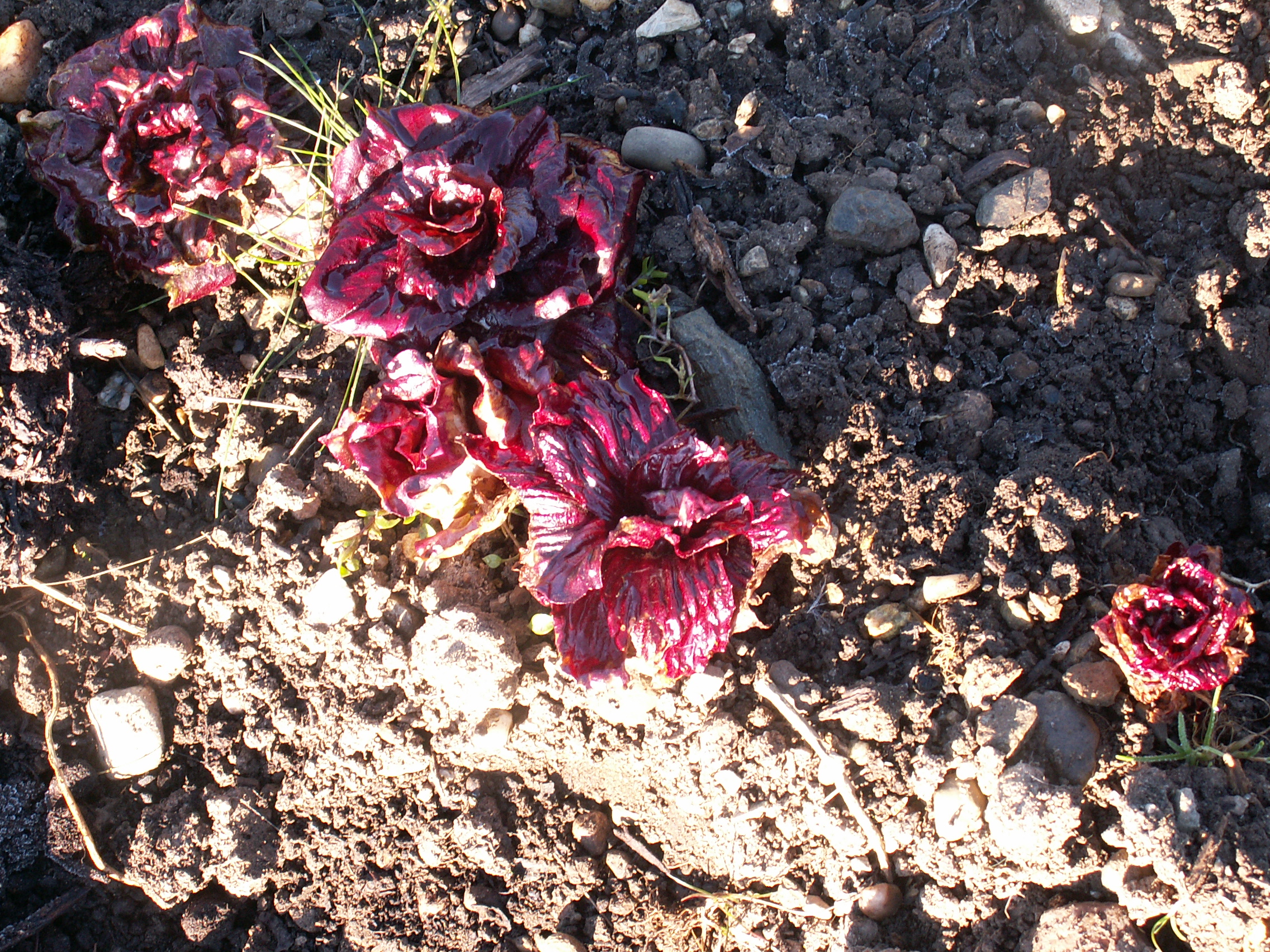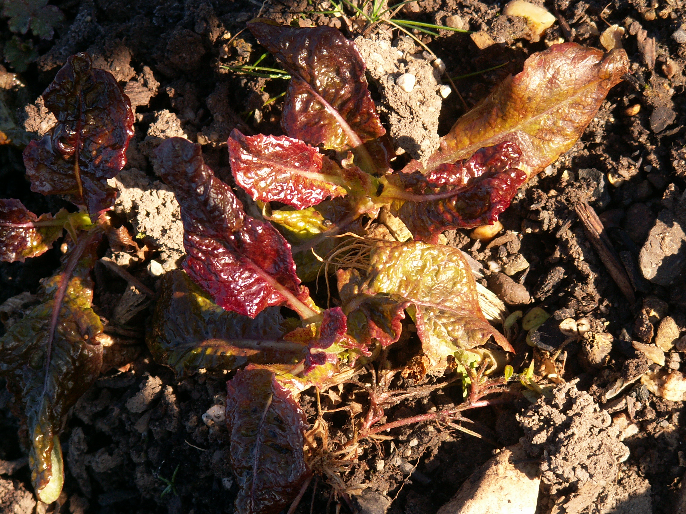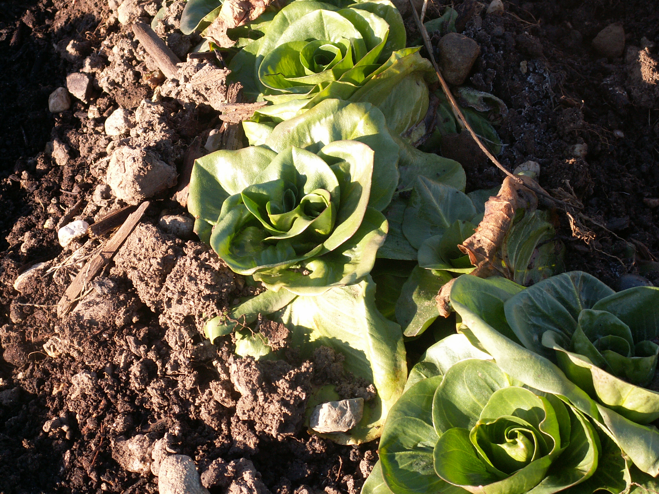 Ce qu’il y a de bien avec un jardin, c’est que moyennant quelques gestes en automne, il continue de vivre en hiver, et l’approche du printemps va nous offrir quelques trésors bienvenus. Ici de quoi agrémenter les salades ces prochains temps. En haut à gauche du rampon(ou mâche, ou trochette,…). Je l’ai semé tard, il n’est pas très gros, mais une petite poignée suffit à vivifier une salade d’endives. En-haut à droite, de la chicorée grumolo, qui fait de jolies rosettes. Encore un de ces trucs à semer en plein été, mais quel bonheur au printemps, si on aime un peu l’amer. En-bas à gauche, de la Trévise dont nous avons déjà mangé quelques rosettes en fin d’automne, mais ça repousse et donne aussi de la couleur dans les salades de printemps.Et à droite de la laitue à tondre(brune américaine) semée trop tard en automne, mais dont quelques rescapées finiront aussi dans nos crudités de printemps. J’ai aussi laissé en place les troncs des salades « pains de sucre » que nous avons mangées en fin d’automne,et ils « rebiollent », encore un peu de verdure à salade(pas de photo).