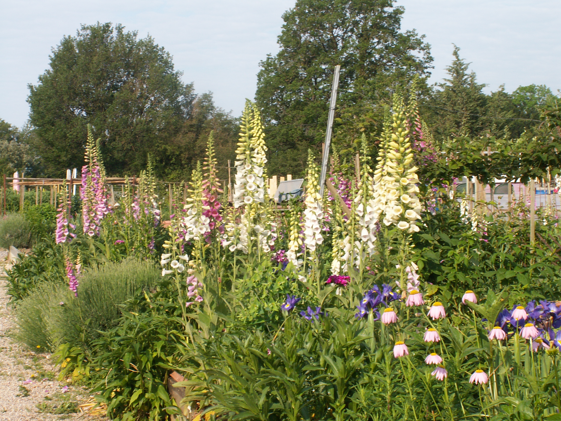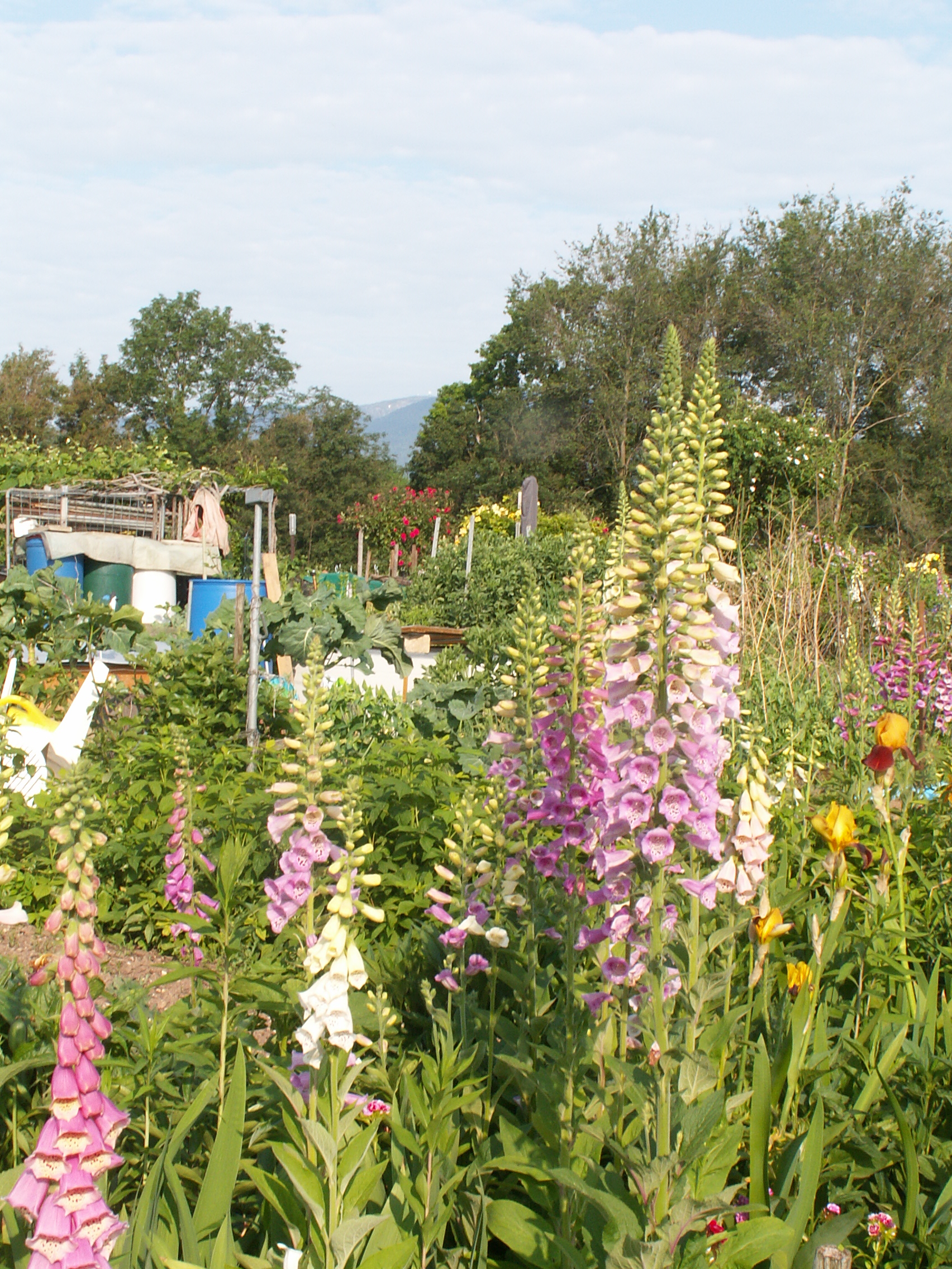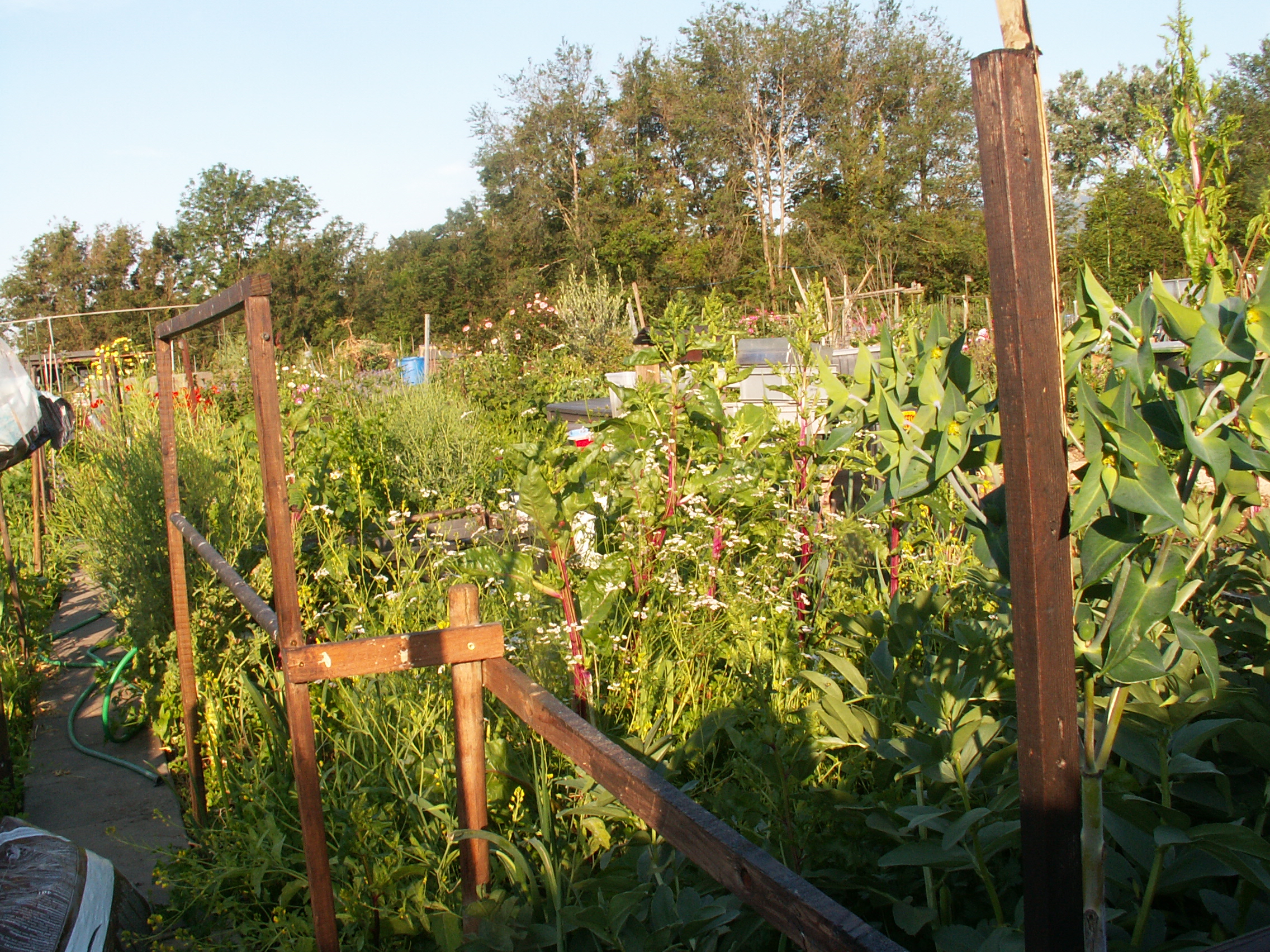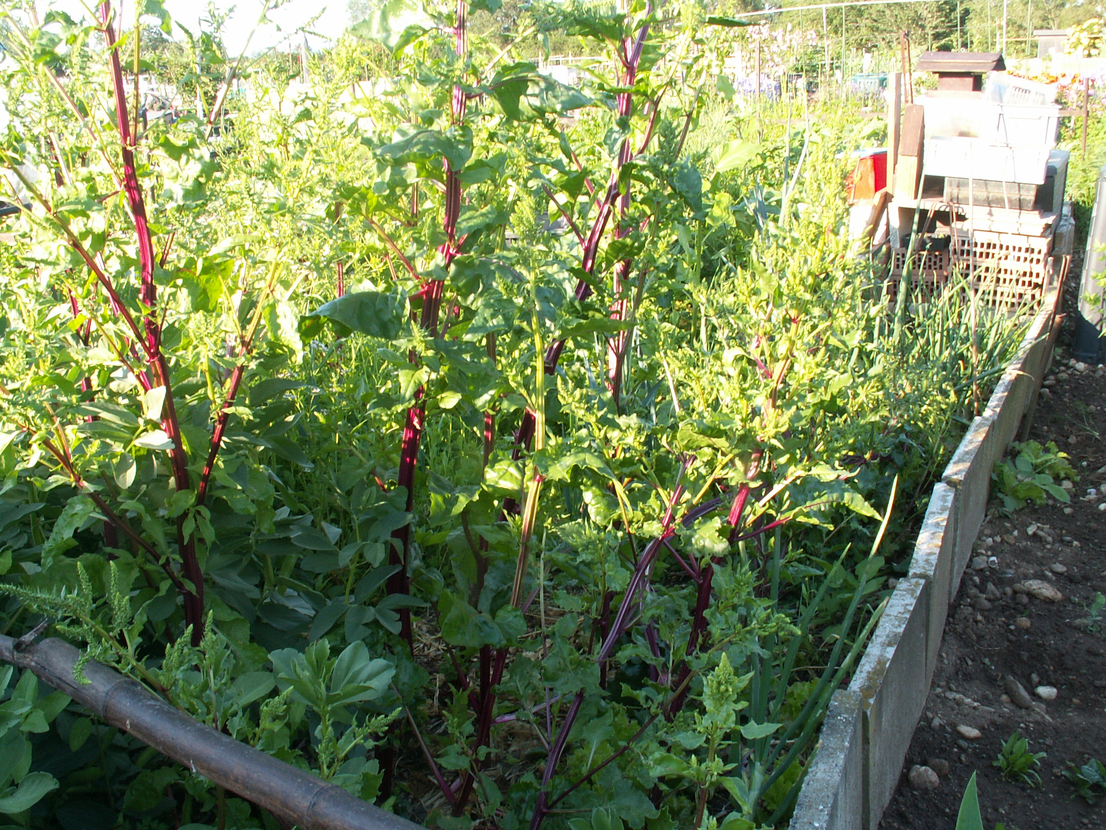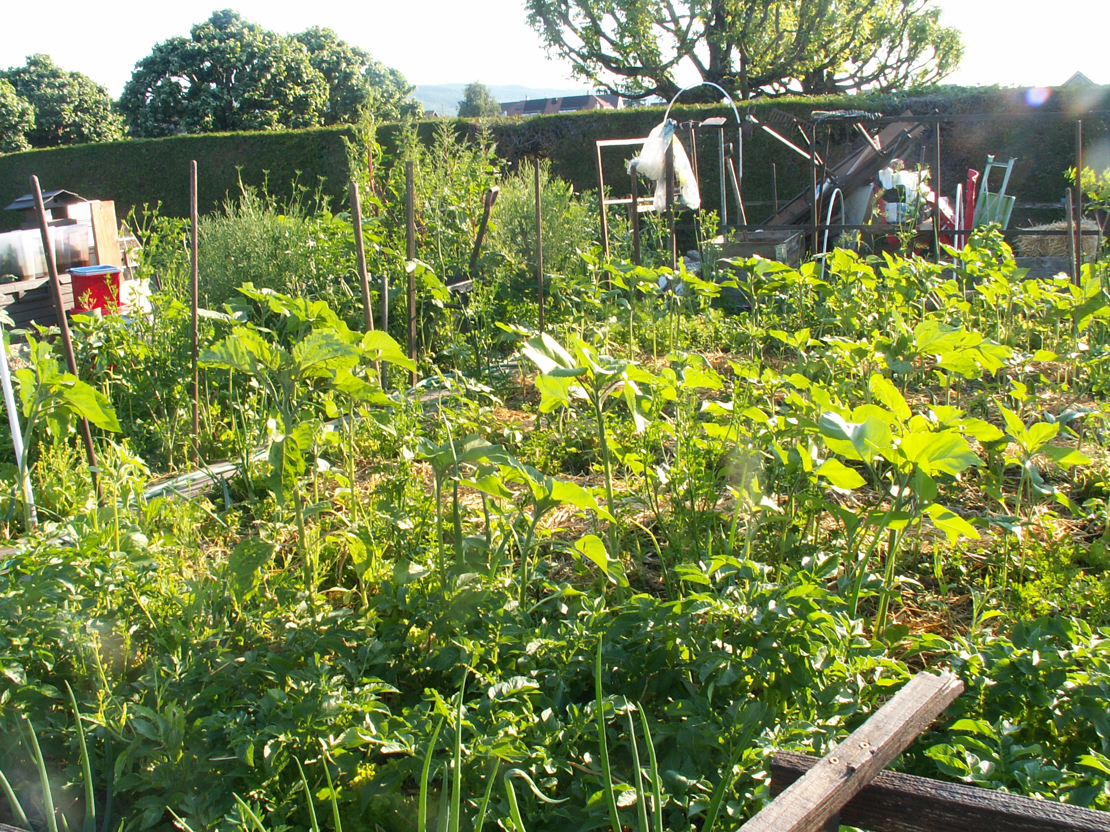 L’avantage de jardiner dans un lotissement de jardins familiaux est sans doute le contact avec les voisins et le partage de savoir-faire et visions diverses. J’avais déjà repéré pas loin de ma nouvelle parcelle ce jardin luxuriant au fouillis créatif, mais néanmoins organisé. Hier matin, j’ai rencontré le jardinier que j’ai complimenté sur sa manière de pratiquer, et à qui j’ai aussi posé quelques questions sur la permaculture, puisque c’est bien de cela qu’il s’agit. Alors que dans beaucoup des lopins environnants, la terre n’est pas encore couverte par les cultures, même si la croissance rapide des longues journées de juin va accomplir son oeuvre, chez lui c’est déjà entièrement vert depuis longtemps. Il laisse en hiver tout ce qui veut bien hiverner: côtes de bettes, betteraves, persil plat et herbes  aromatiques diverses. En ce moment, certaines plantes montent en graines, alors que par exemple, les tournesols de l’an dernier se sont ressemés un peu partout.