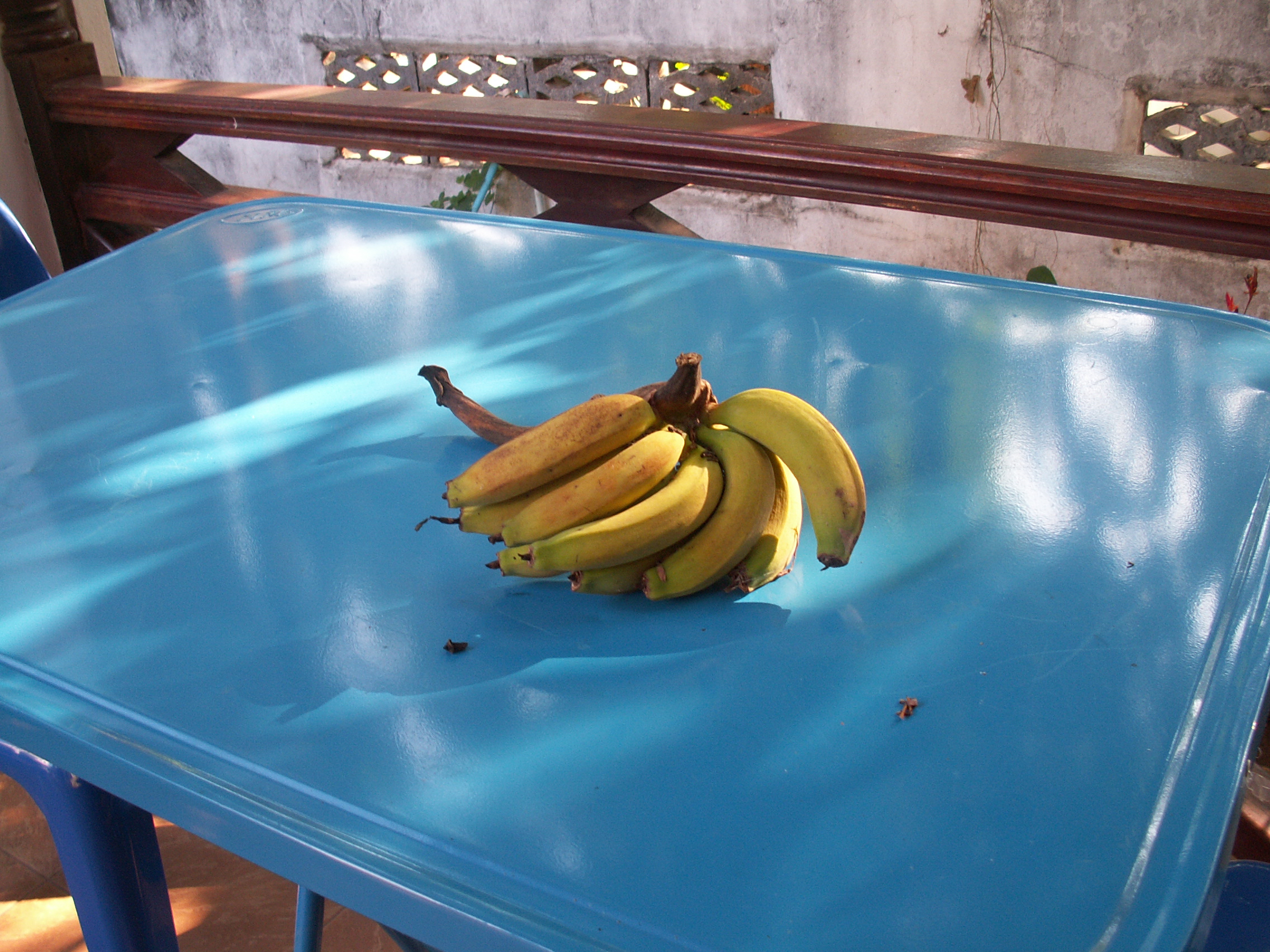 Pour continuer dans le thème des bananes, il nous faut mentionner les très goûteuses bananes grillées qui se vendent au coin des rues et sont délicieuses toutes chaudes. Nous avons eu l’occasion d’en déguster hier lors de notre cours de lao, c’est le prof. qui a fourni le goûter! (et nous n’avions plus faim pour le souper)
