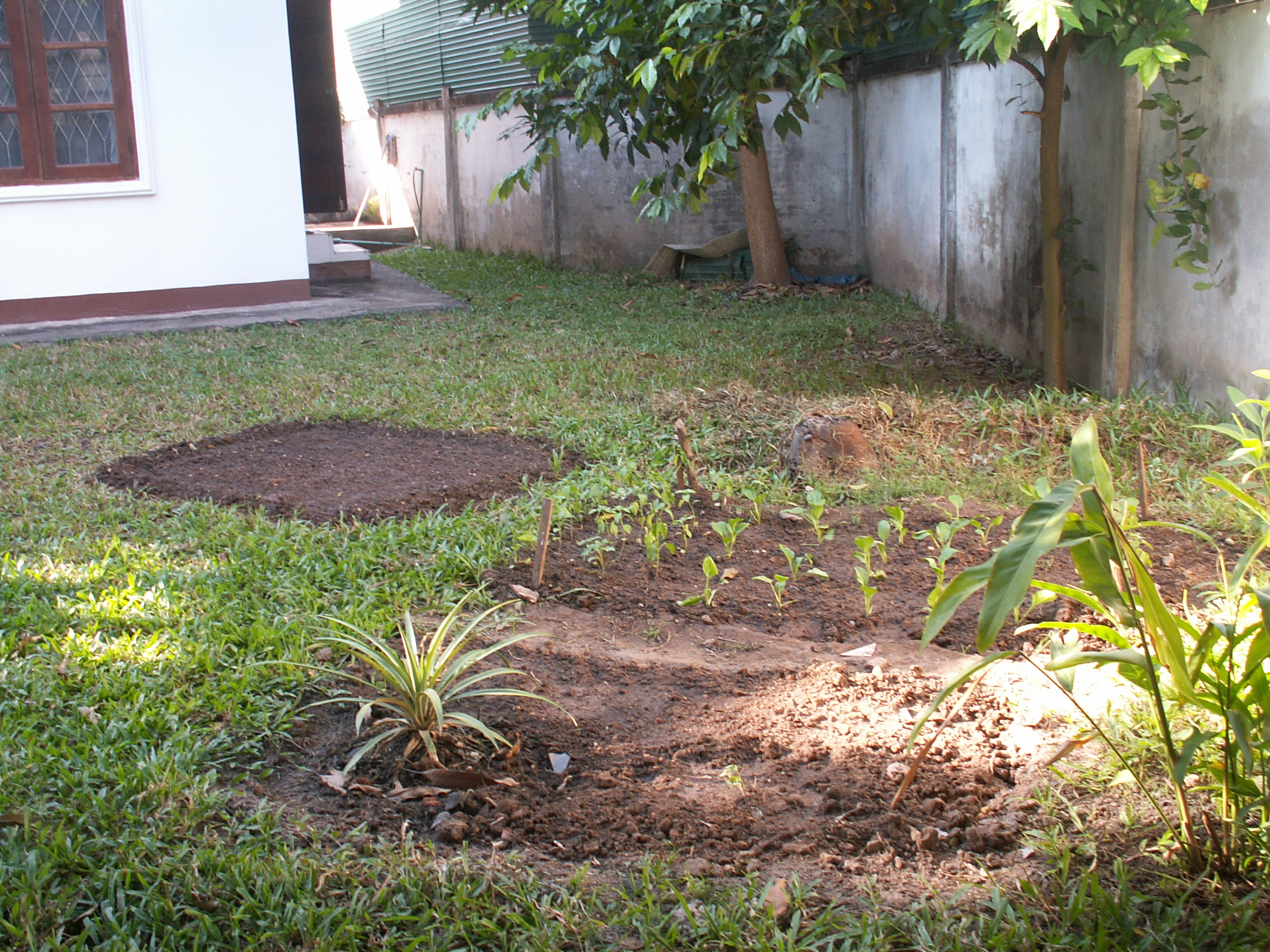 L’autre personne qui a contribué, c’est notre mè-ban qui a eu des plantons par sa mère et nous a planté quelques légumes d’ici. Vous voyez son carreau avec les jolis plants bien alignés. J’espère que les escargots et limaces épargneront tout ça, car ils m’ont ravagé mon semis précédent de capucines qui avaient bien levé mais dont il ne reste qu’un plant.