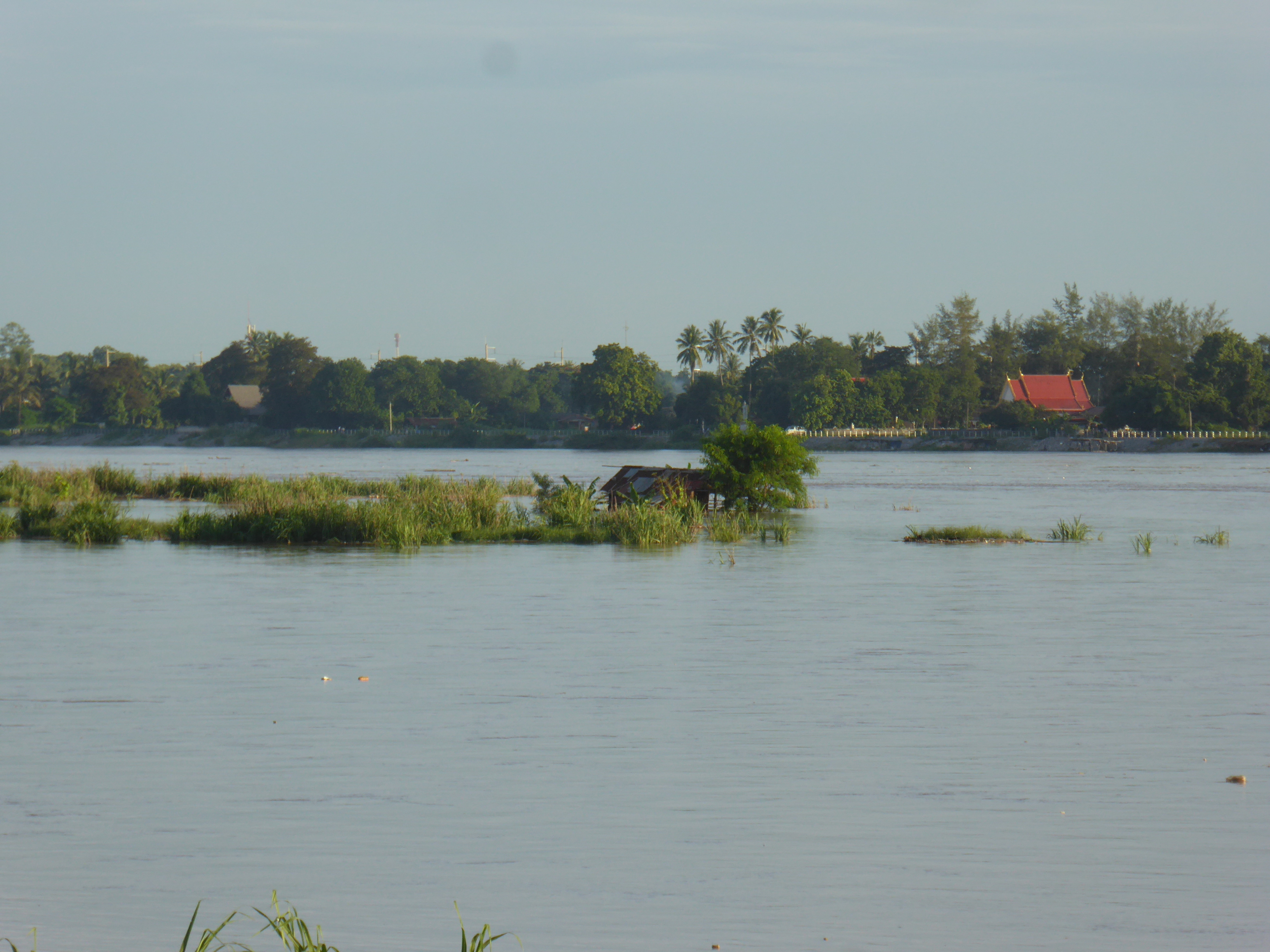 Voici une photo que nous avions prise le 15 juillet, alors que le Mékong était en crue. Il ne restait plus que quelques petites îles, et la pauvre petite maison à l’extrémité de celle-ci semblait avoir bien les pieds dans l’eau. Le niveau d’eau était impressionnant à ce moment-là, et on commençait à parler de cote d’alerte.