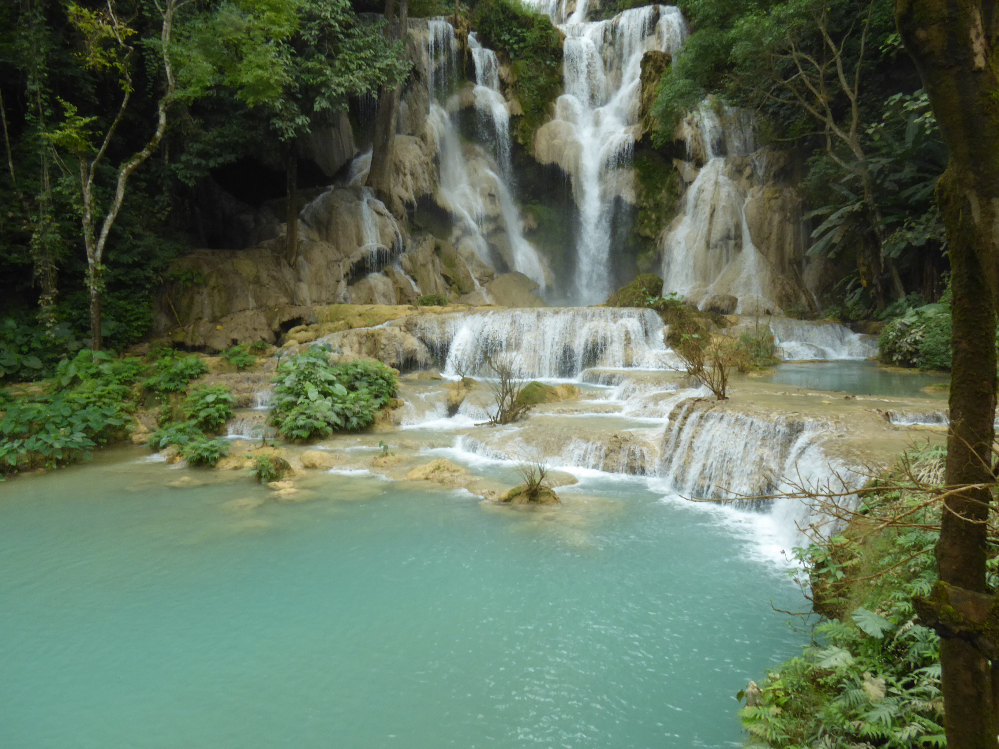 Et encore une cascade, plus haute celle-ci. Nous avons pu monter au départ de la chute, traverser à gué et redescendre de l’autre côté. Un vrai plaisir pour petits suisses, que nos collègues laotiens n’ont pas boudé. Mais certaines dames ont eu des courbatures le lendemain! (pas nous bien entraînés par notre récent passage au pays!)