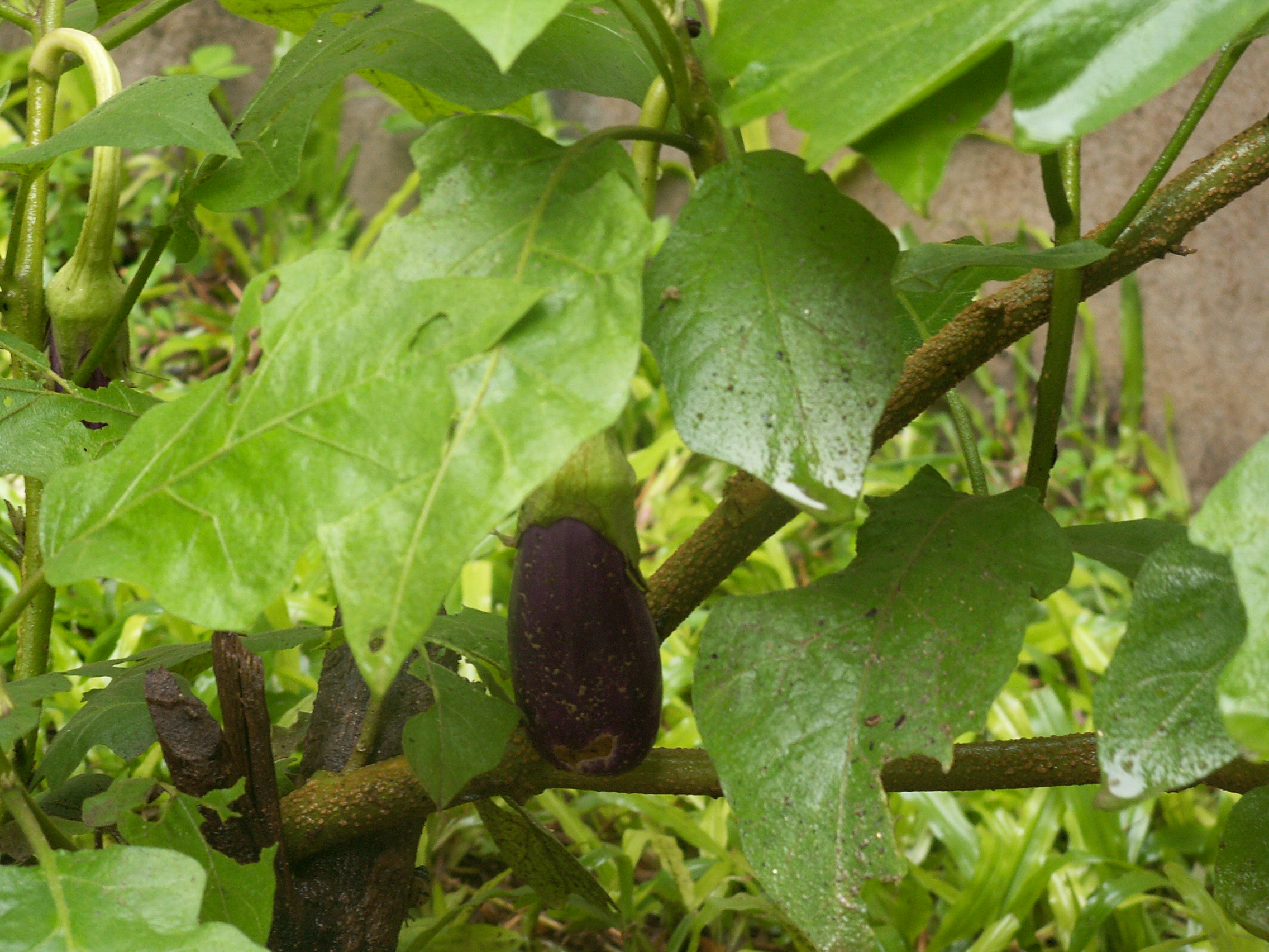 jardin de saisonEt tout au fond, ce plant d’aubergine qui jusqu’à maintenant fleurissait sans rien donner et que je voulais arracher se met à produire. Je l’avais acheté à une foire/présentation d’ONG de la région, et celle qui me l’a vendu m’avait dit que c’étaient des petites aubergines vertes. Apparemment, elles sont violettes, c’est sympa aussi.