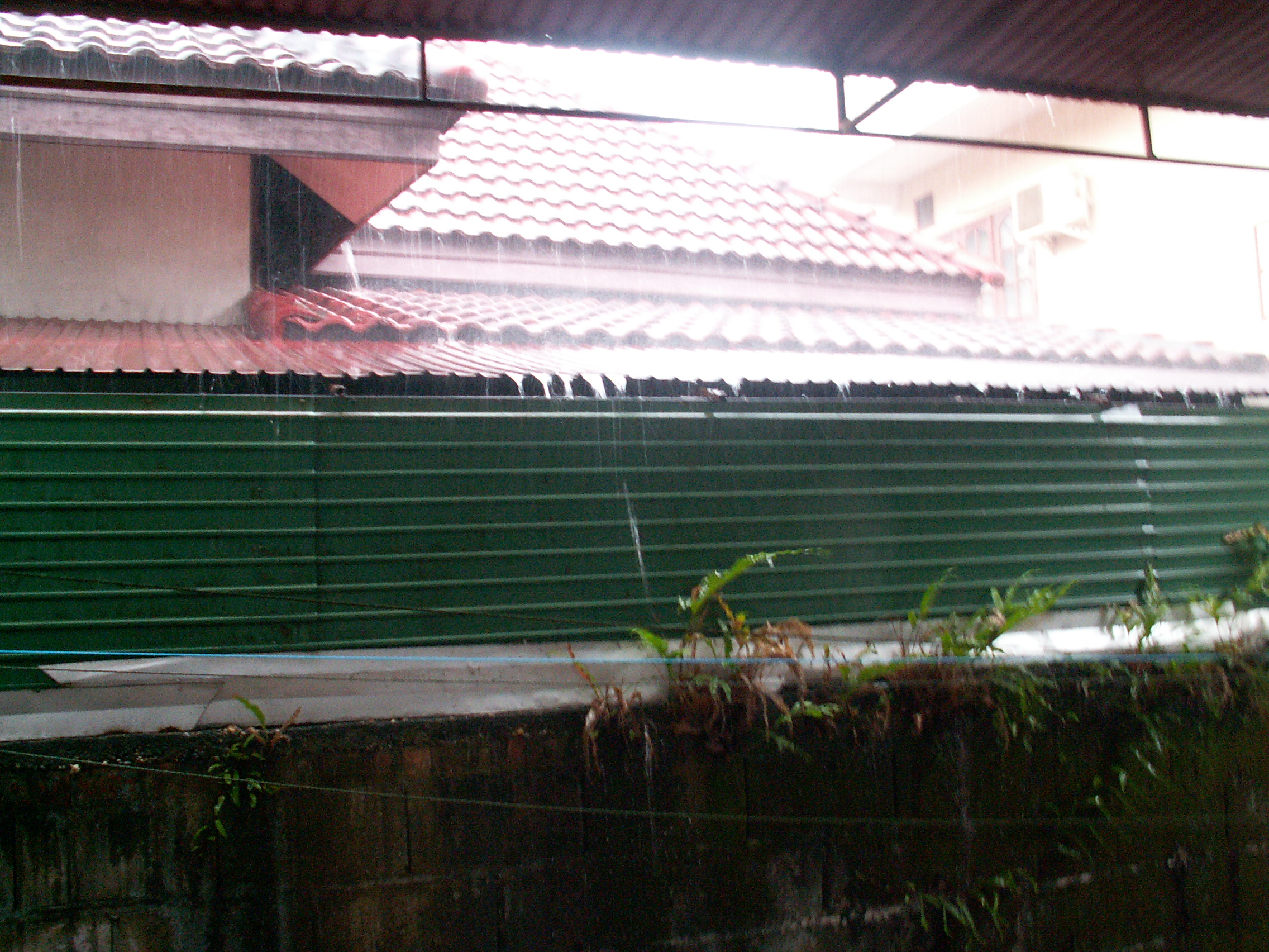 Vue sur l’arrière de notre maison pendant une belle averse orageuse qui se déroule en ce moment. L’eau ruisselle en mini cascades d’un toit à l’autre et finit dans le petit canal à cet usage qui passe derrière notre maison, puis derrière celle du voisin et probablement rejoint un canal plus gros quelque part. Après avoir bien cuit certains jours ces derniers temps, nous accueillons cette pluie avec bonheur. Elle arrive un peu tard dans la saison et certains agriculteurs sont en difficulté dans leurs cultures de riz.