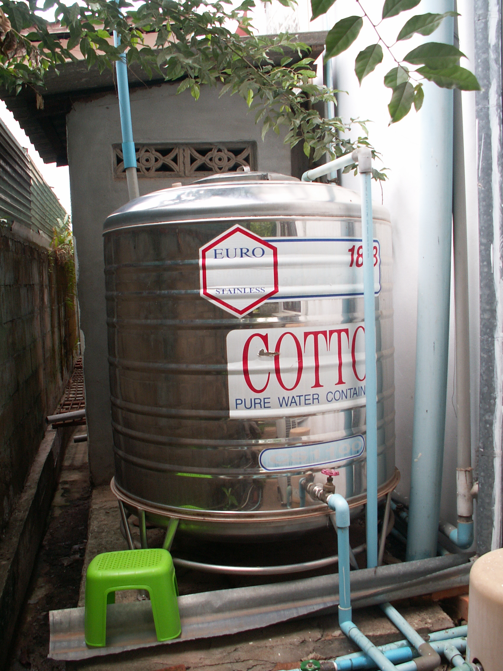 Histoires d'eauComme dans toute la ville, l’approvisionnement en eau dans notre quartier n’est pas continu. En fait nous sommes livrés essentiellement la nuit. C’est pourquoi derrière notre maison trône un gros réservoir en inox d’une capacité de 1100l, et la pompe électrique  qui s’enclenche lorsque nous tirons de l’eau.