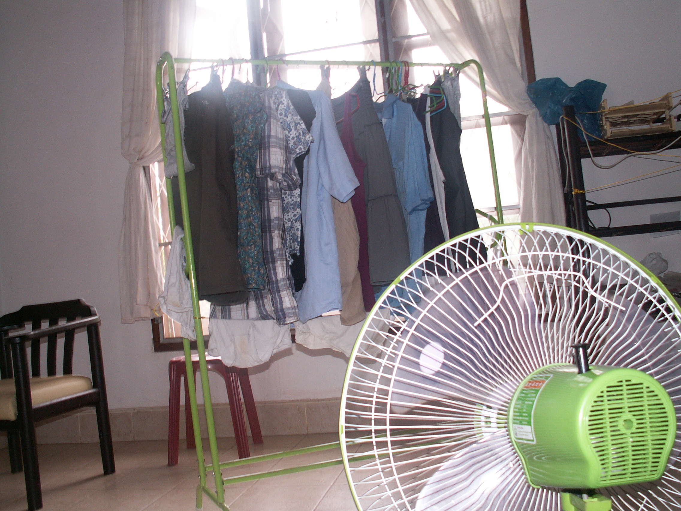 Bon, faut-il que je vous commente la photo postée ci-dessus? L’humidité ambiante fait que rien ne sèche, j’étends donc le linge dedans entre deux ventilateurs, et le séchage se finit au fer à repasser.