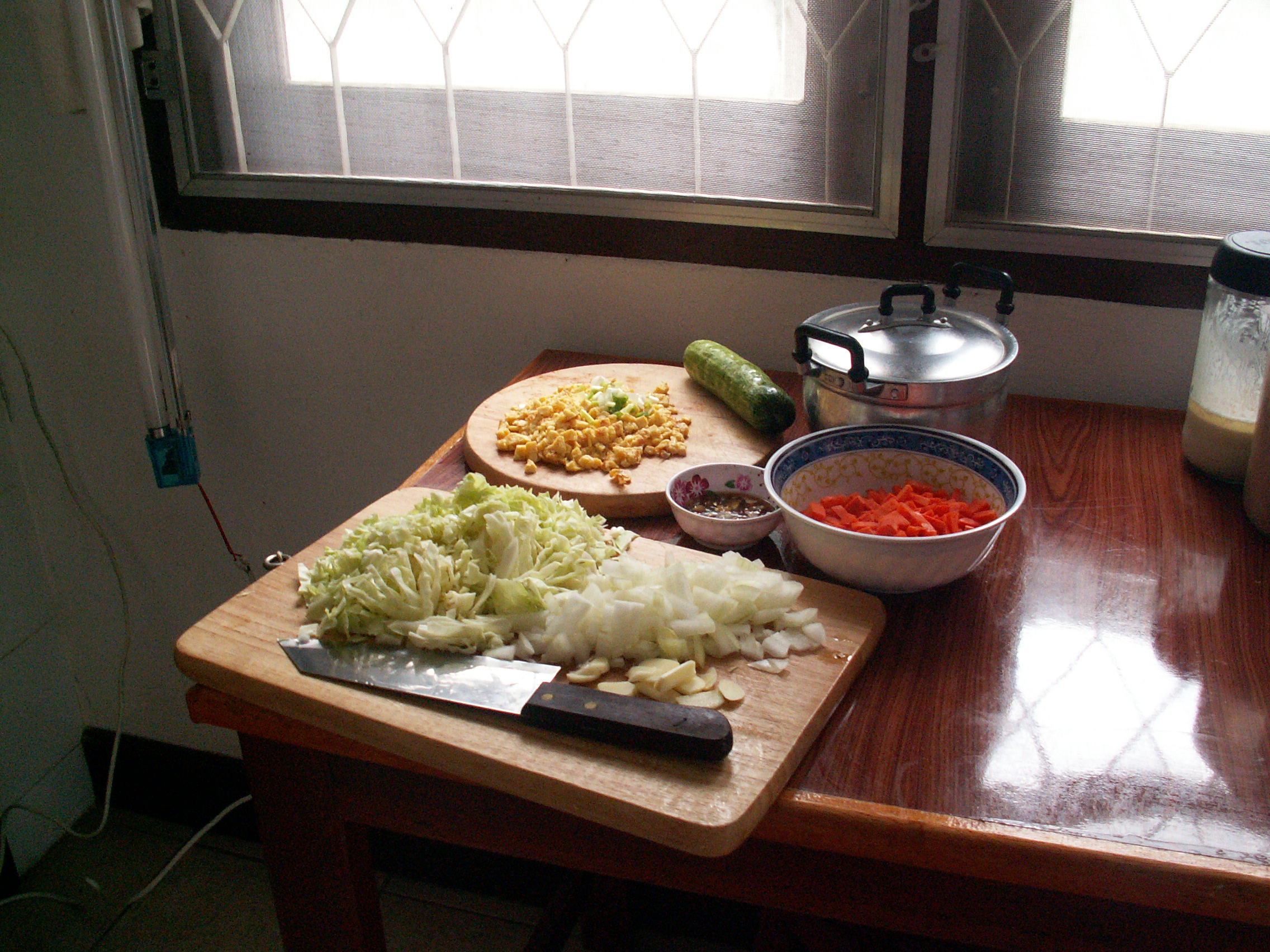 Et là ça va chauffer, pas longtemps, mais il y faut une présence continue. On chauffe donc le bouillon qui sera servi avec le mets, on met de l’huile dans le Wok et départ sur feu vif. D’abord l’ail et l’oignon, puis la carotte et le chou, ensuite le riz et l’omelette émincée en dernier. Il faut bien travailler de la spatule  pour éviter de cramer son repas.