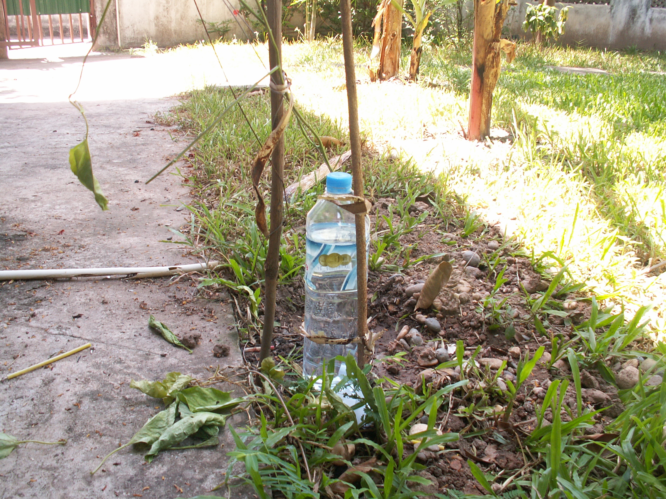 Jeudi, nouveau cours de langue…Voyant le triste état de la pauvre plante, notre prof décide qu’il faut la mettre aux soins intensifs et lui poser un goutte à goutte. Une bouteille de 1.5l en plastic fera l’affaire. On la perce en-bas d’un trou dans lequel on fait passer un bout de tissu en coton et on la remplit d’eau. puis on fixe le tout au chevet du malade, auquel on a enlevé toutes  ses feuilles sèches. L’espoir est que la plante reprenne et se mette à produire de nouveaux bourgeons. Bien sûr que le mieux qui puisse lui arriver serait le retour des pluies!