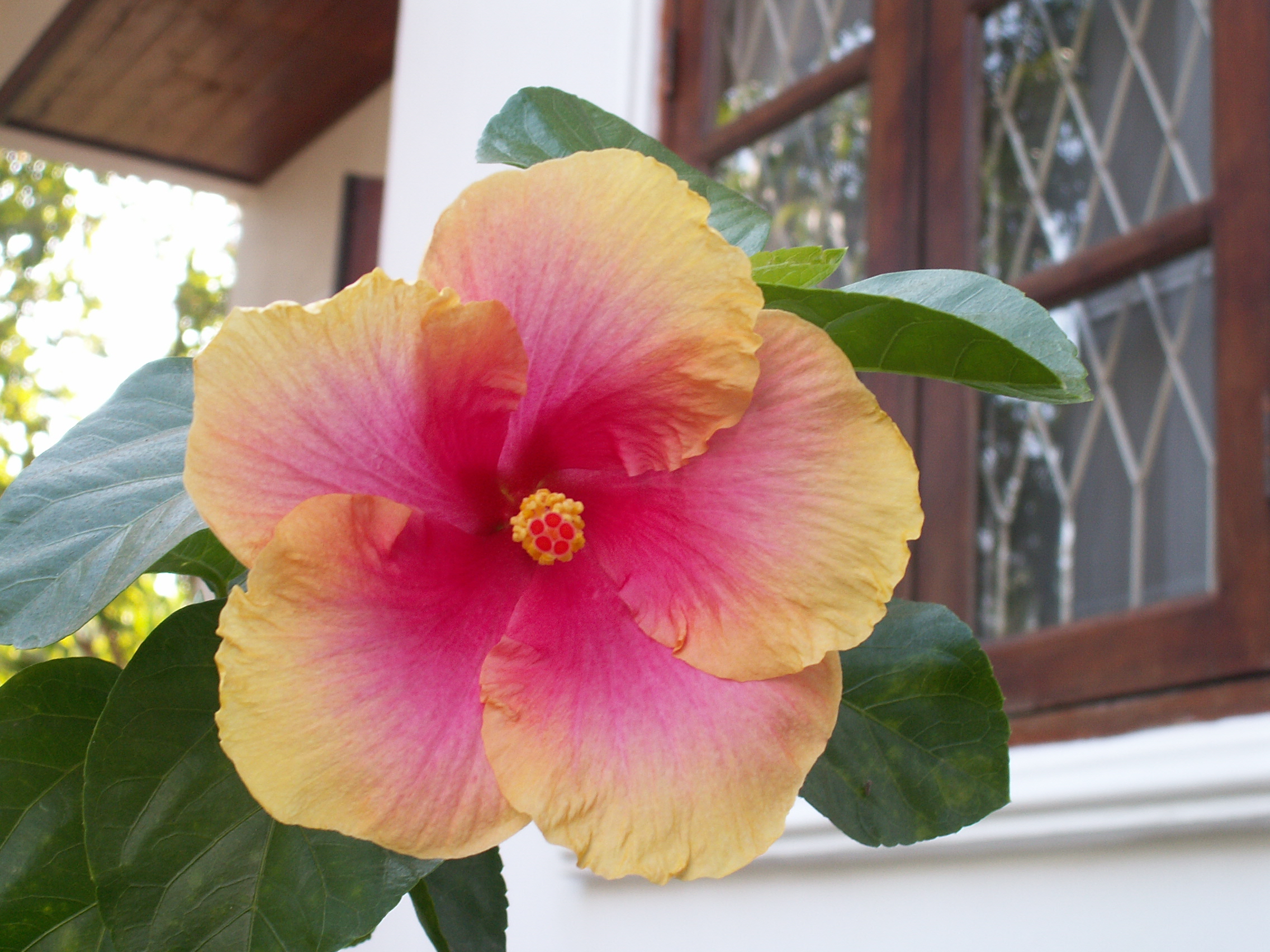 Ce jardin de devant comporte aussi quelques plantes à fleurs: hibiscus, et d’autres dont je n’ai pas le nom, et aussi des plantes décoratives à feuillage coloré que l’on bichonne en Suisse dans des pots à l’intérieur.