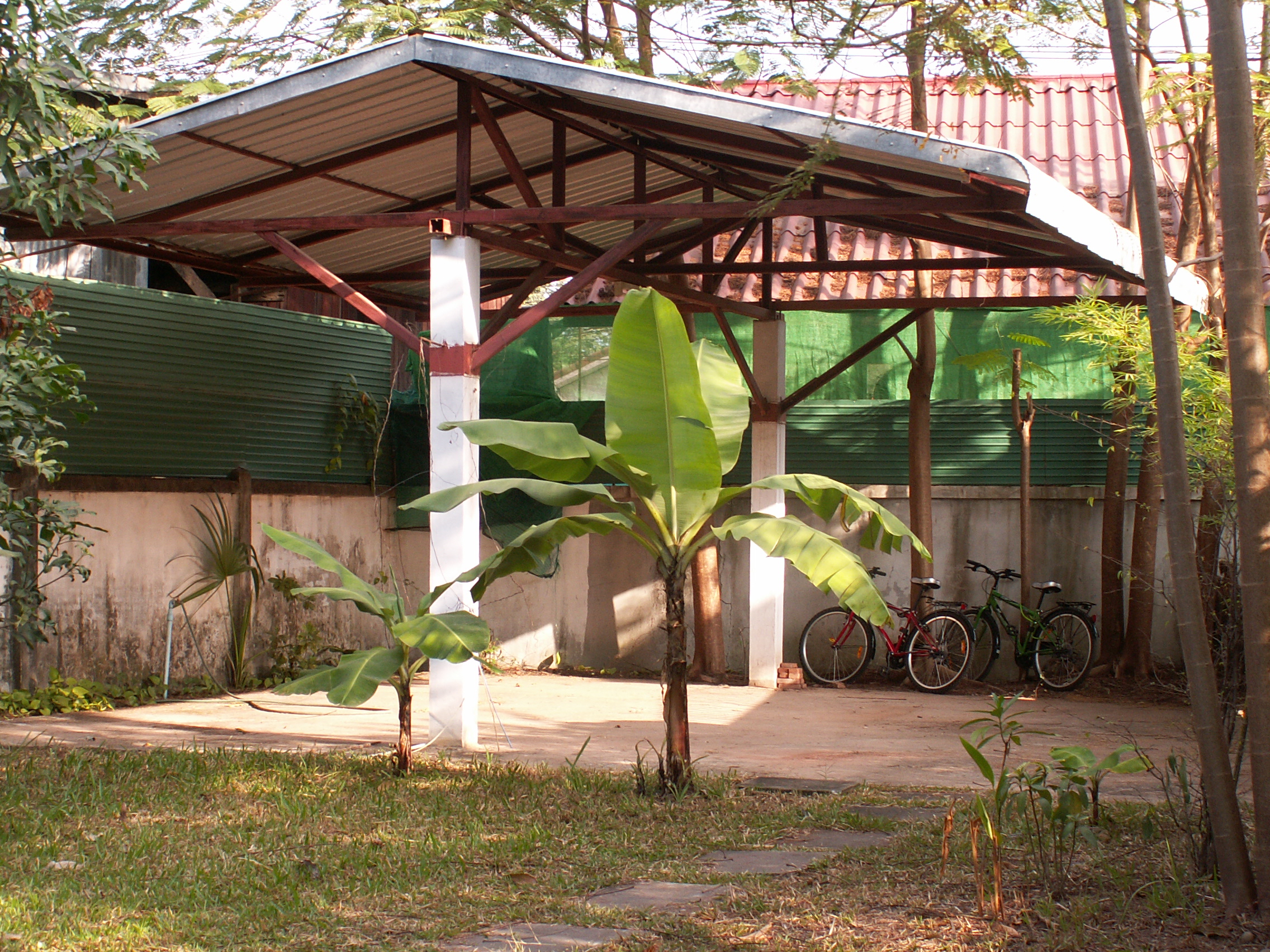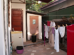 Derrière la maison laotienne, en général, une petite cour en dur couverte. c’est l’endroit de la buanderie et pour l’étendage du linge. On y accède par la cuisine, et tous les écoulements se dirigent vers une espèce de canal au pied du mur(à droite sur la photo. Vous remarquerez la machine à laver basique qui lave à l’eau froide, et le bricolage d’écoulement qui mène au-dit canal d’évacuation. C’est aussi le coin de la poubelle, et le coin favori des moustiques.