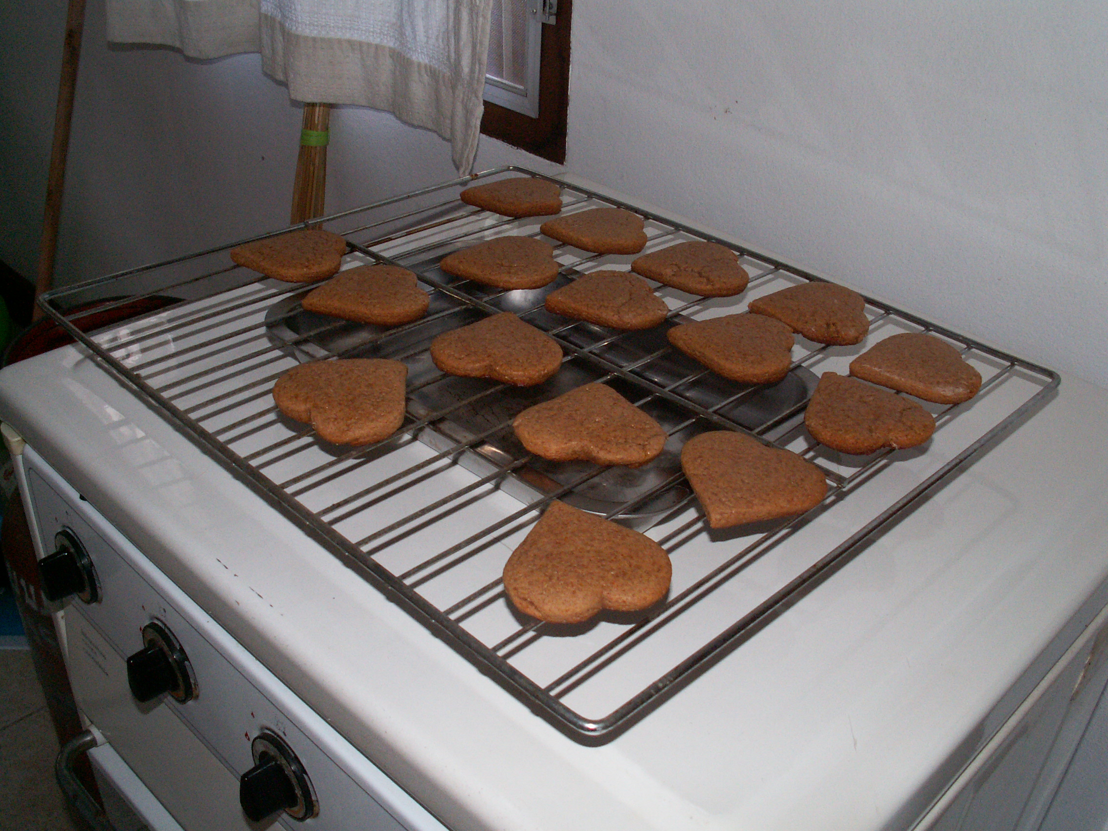 Hier, j’ai décidé de tenter des pains d’épices, avec du miel thaïlandais qu’on trouve au magasin ici et des épices à pain d’épices de la Migros que j’avais emportées de suisse dans ce but. Je les ai badigeonnés au lait sucré dans le but d’avoir un peu de couleur dessus, et enfournés assez haut. Le résultat est plutôt joli à mon goût, et à la dégustation cela ressemble à ce que l’on attend.