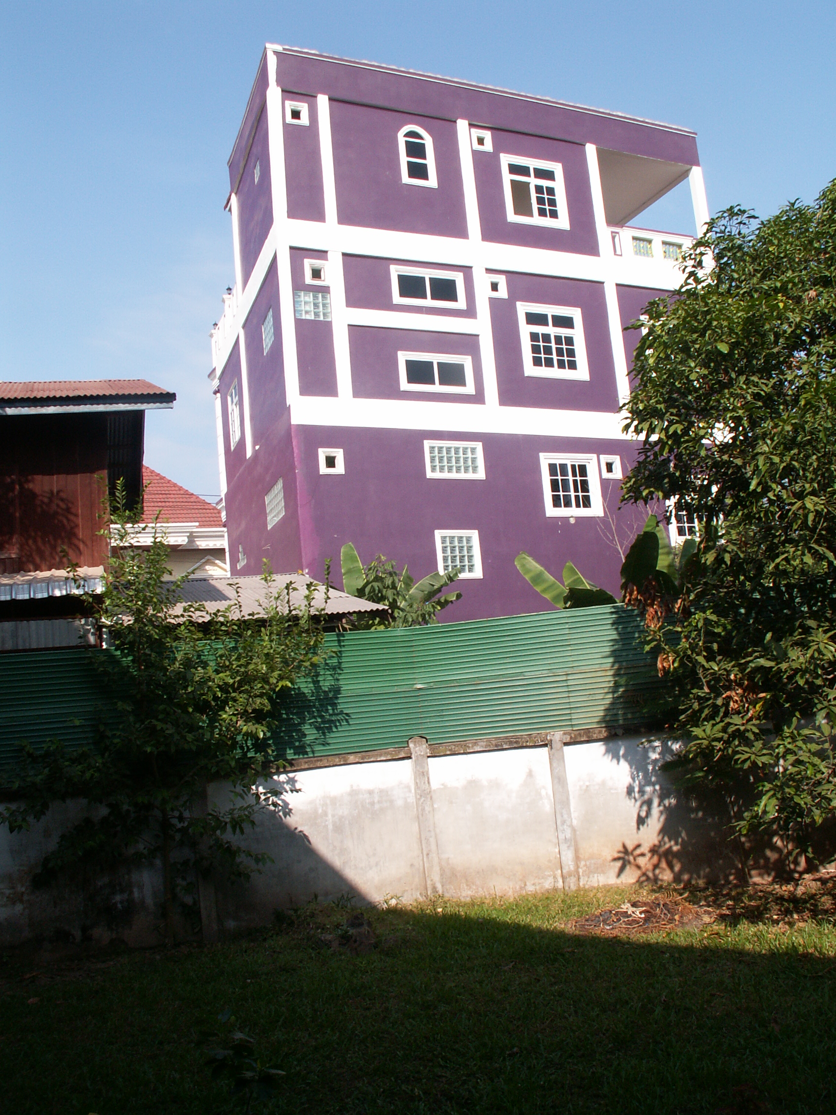 Maisons pour tous les goûts(2)De l’autre côté de l’impasse qui mène à notre portail d’entrée se trouve une maison de style plus traditionnel lao, avec l’étage en bois. On en voit de moins en moins à Vientiane, la tendance actuelle étant de construire en dur. Si vous cliquez sur l’image pour voir en grand, vous remarquerez le cocotier géant à l’arrière plan, avec son beau chargement de noix.
