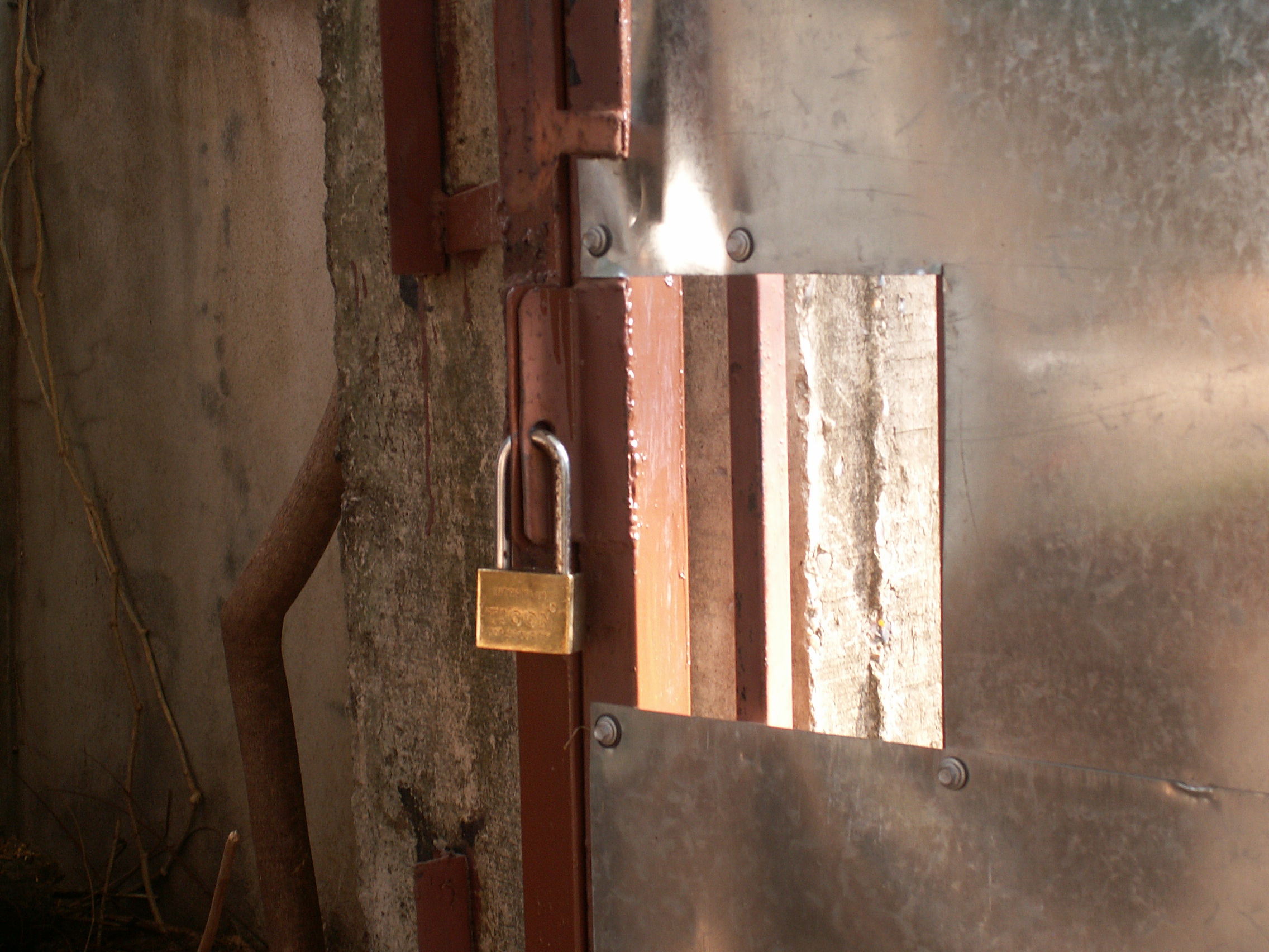 Nous avons donc: un solide cadenas au portail d’entrée métallique coulissant sur rail. Puis un autre solide cadenas au petit portail pour quand on entre seulement à pied. Ensuite double serrure à la porte d’entrée.
