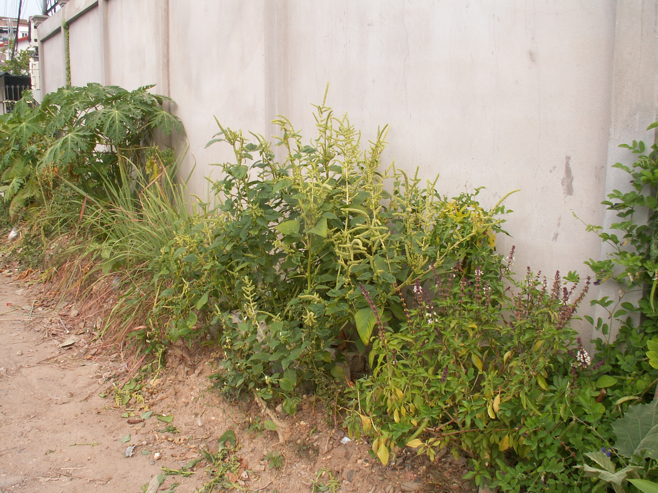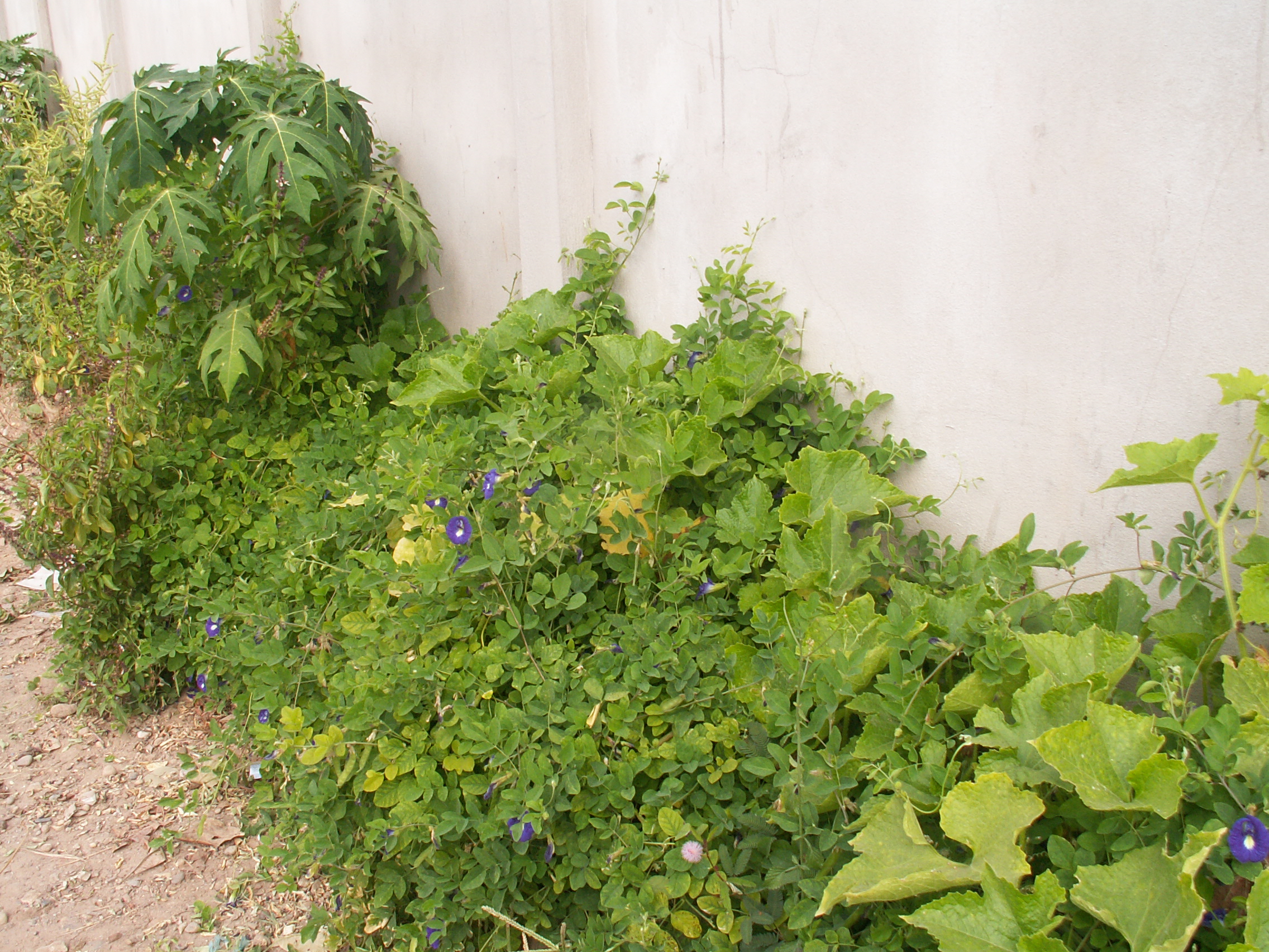 Contre le mur, c’est un jardin urbain, même si cela ne saute pas aux yeux de nous autres européens.En haut, de gauche à droite: un petit papayer, des pois à fleurs bleues dont on fait un thé coloré réputé bon pour la santé, et une cucurbitacée, probablement une sorte de courgette. Et en-dessous encore un papayer, de la citronnelle, de l’amarante dont on mange les feuilles, du basilic,…et peut-être d’autres plantes encore que je n’ai pas su identifier.